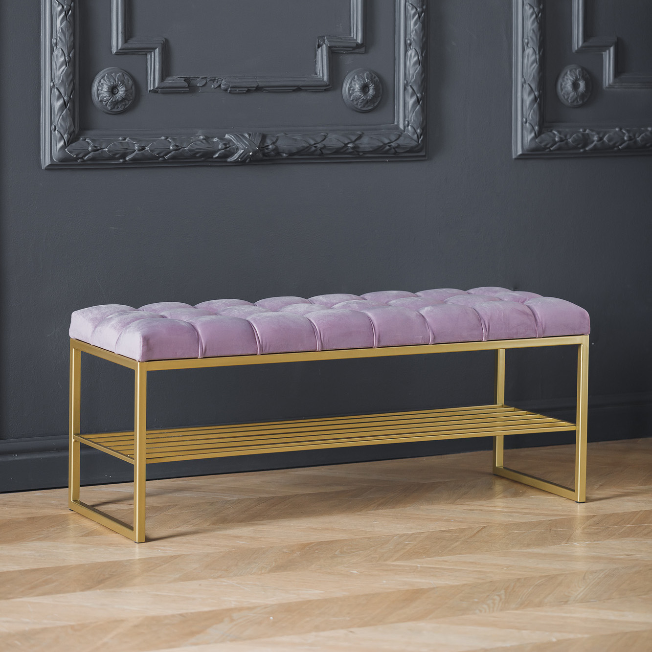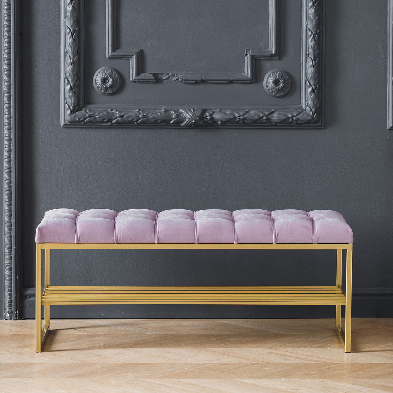 Банкетка RUBY с золотым основанием и мягкой велюровой подушкой в каретной стяжке.