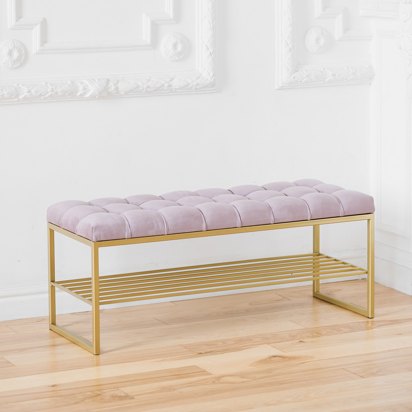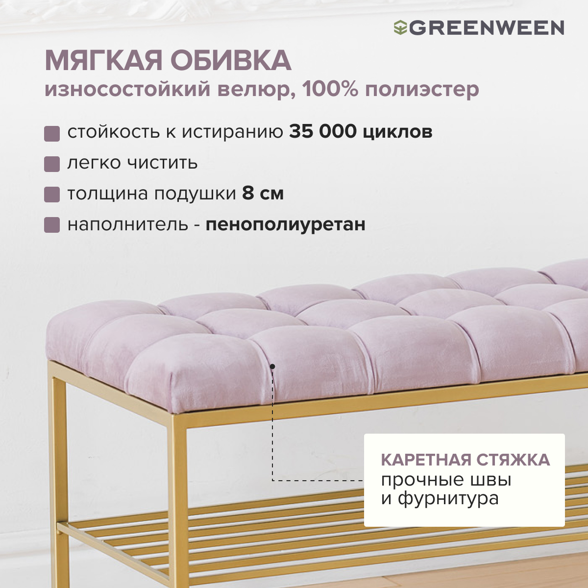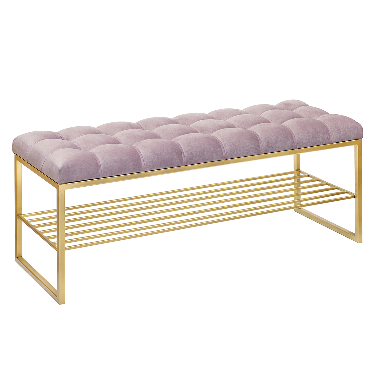 Банкетка RUBY — это стильный и функциональный предмет мебели. У нее золотое основание, мягкое сиденье и удобная полка для обуви.