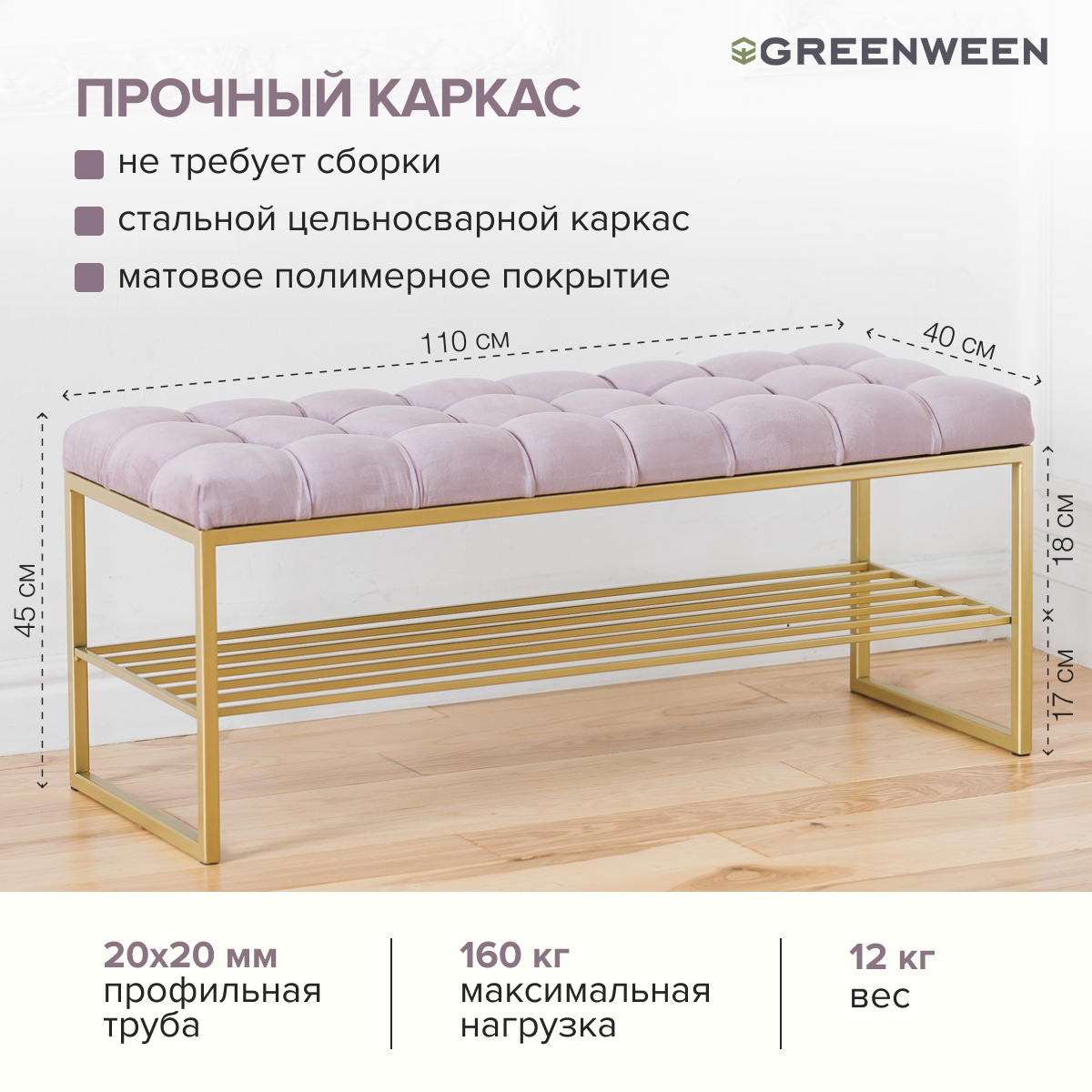 Размеры банкетки — 1100х400х450 мм. Каркас и полка для обуви выполнены из прочной профильной трубы. Мягкое сиденье обито искусственным велюром в каретной стяжке.