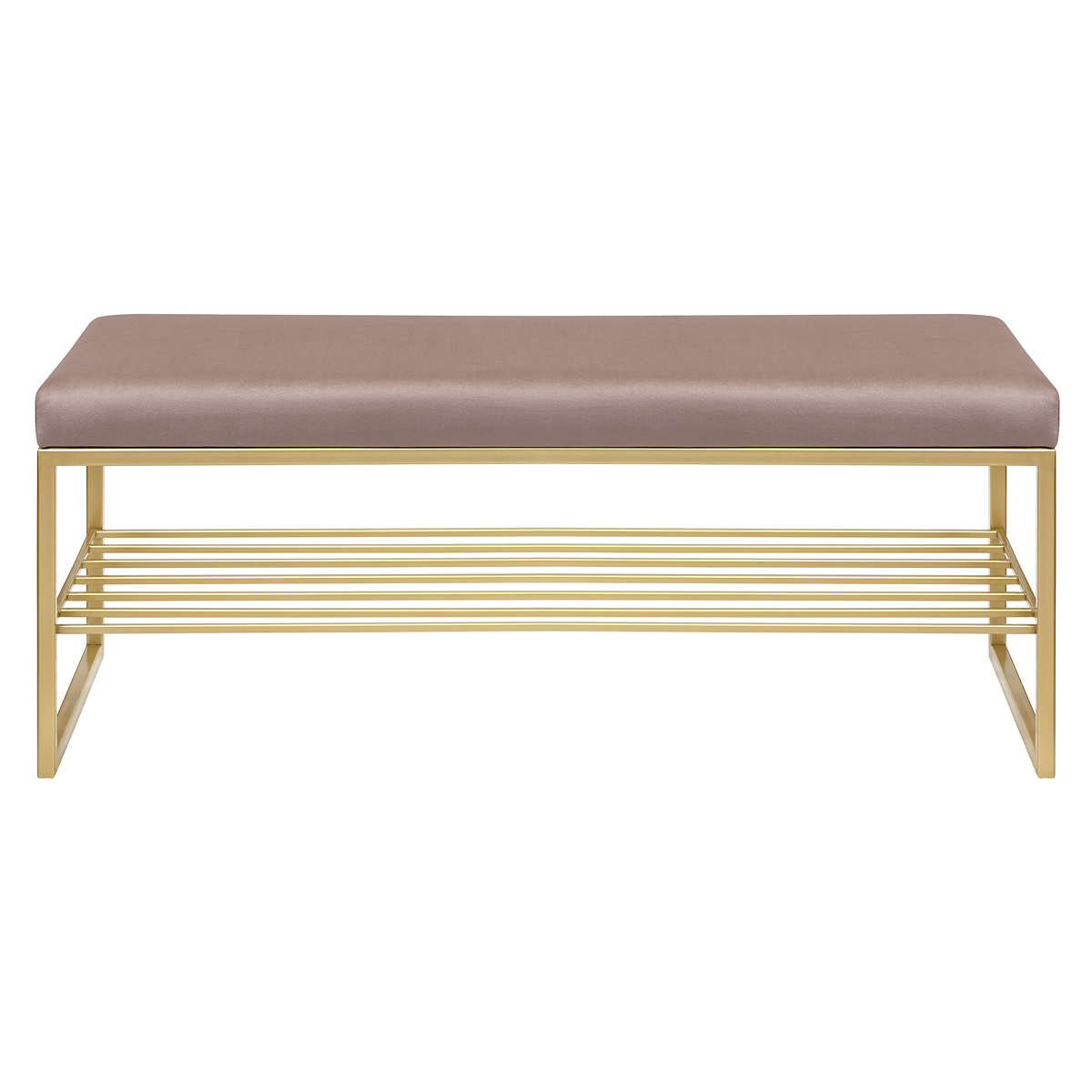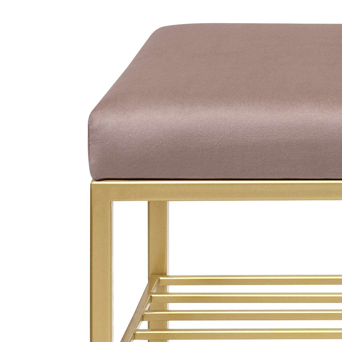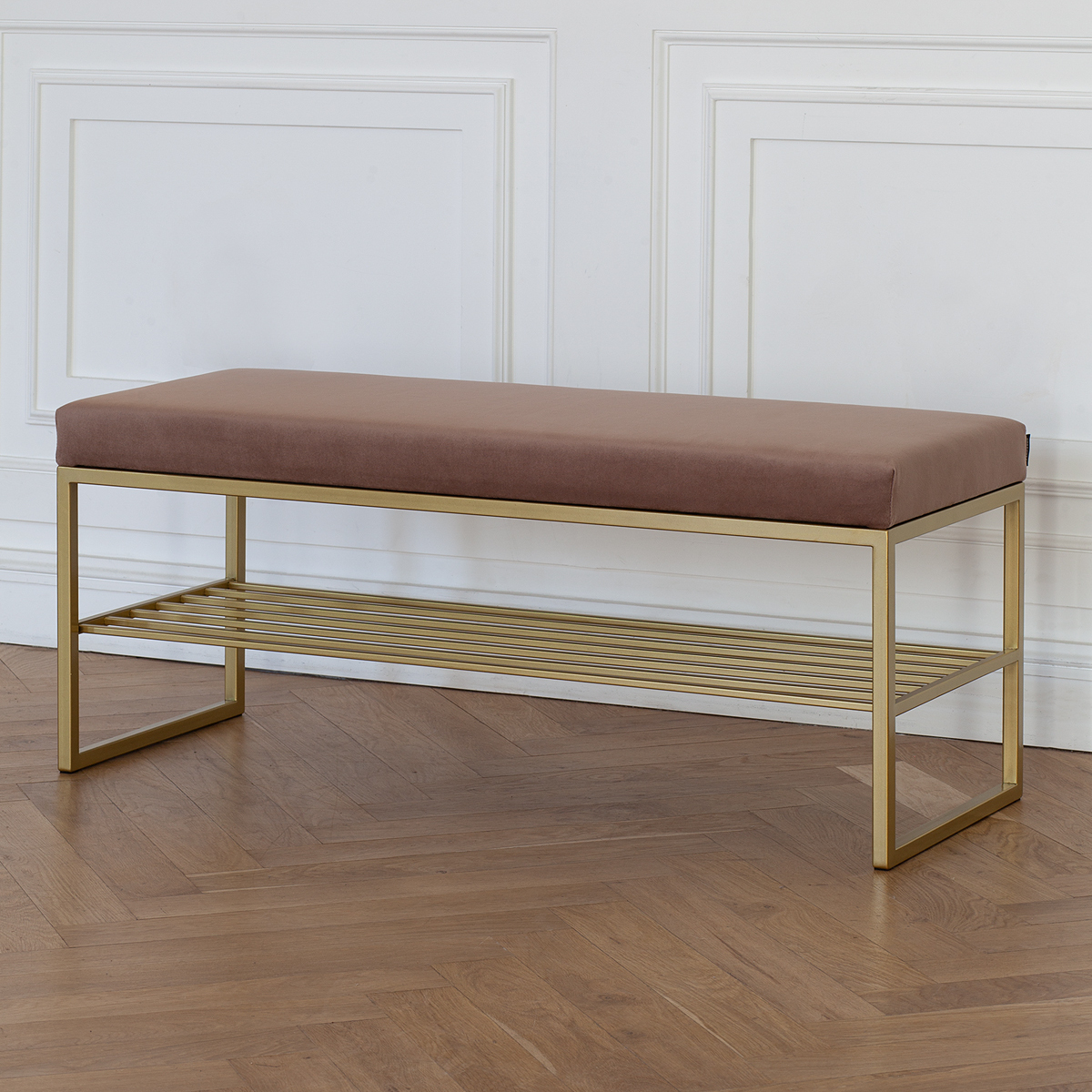 Банкетка RUBY — это стильный и функциональный предмет мебели. У нее золотое основание, мягкое сиденье и удобная полка для обуви.