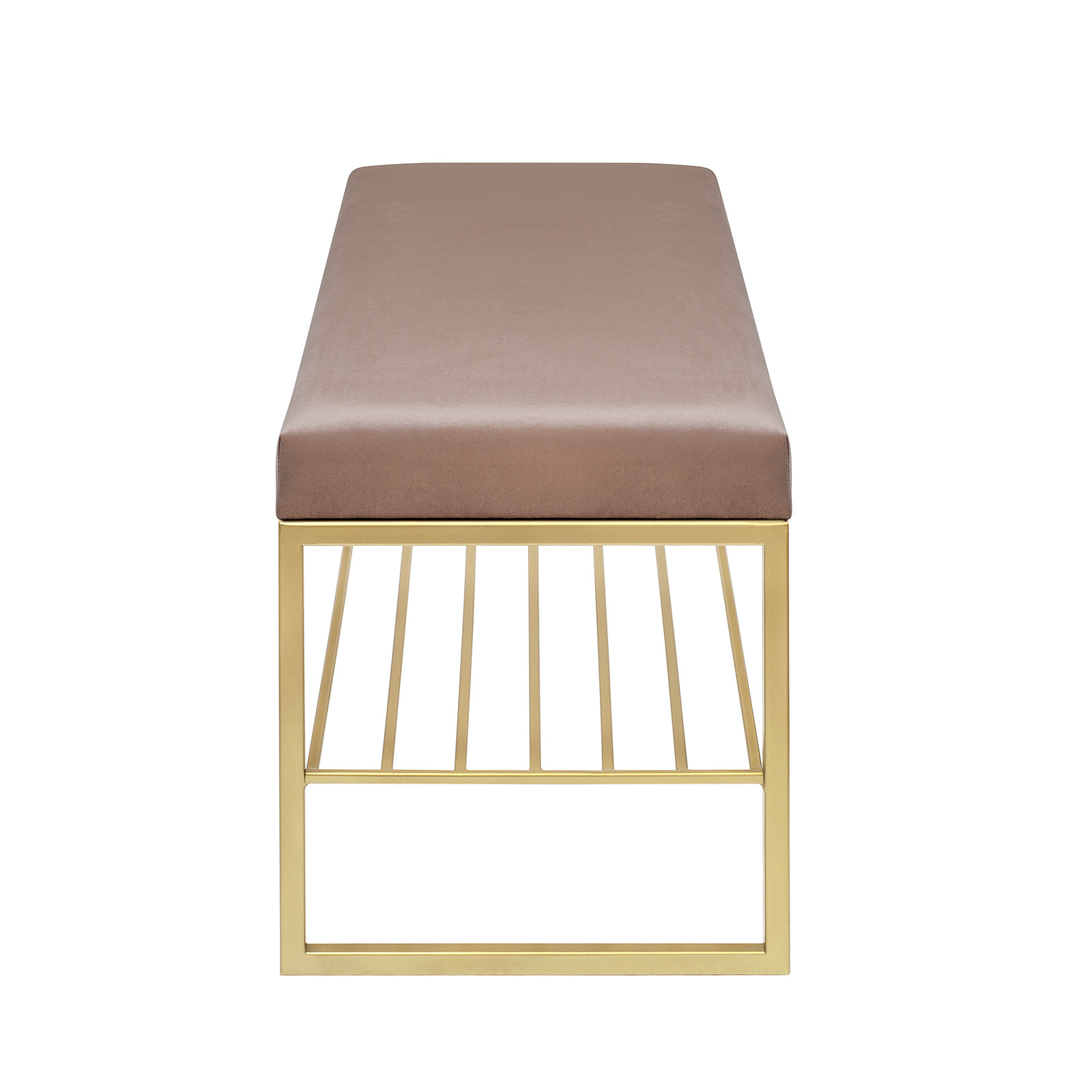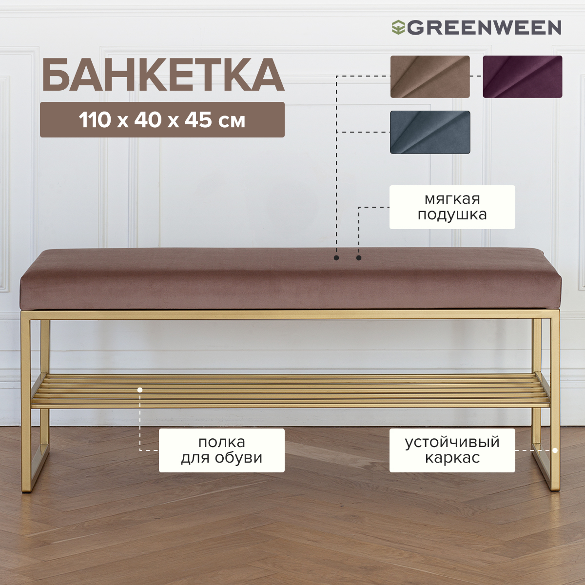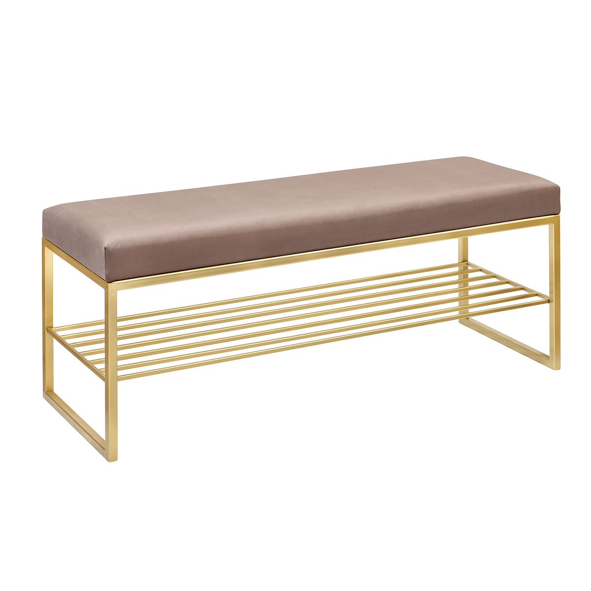 Банкетка RUBY — это стильный и функциональный предмет мебели. У нее золотое основание, мягкое сиденье и удобная полка для обуви.