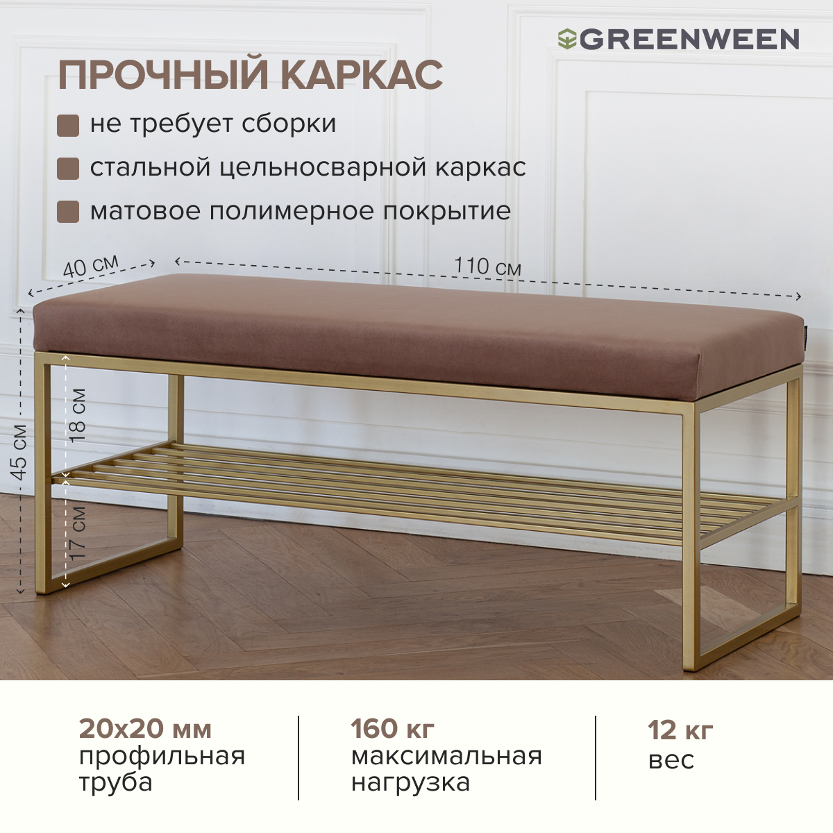 Размеры банкетки — 1100х400х450 мм. Каркас и полка для обуви выполнены из прочной профильной трубы. Мягкое сиденье обито искусственным велюром.
