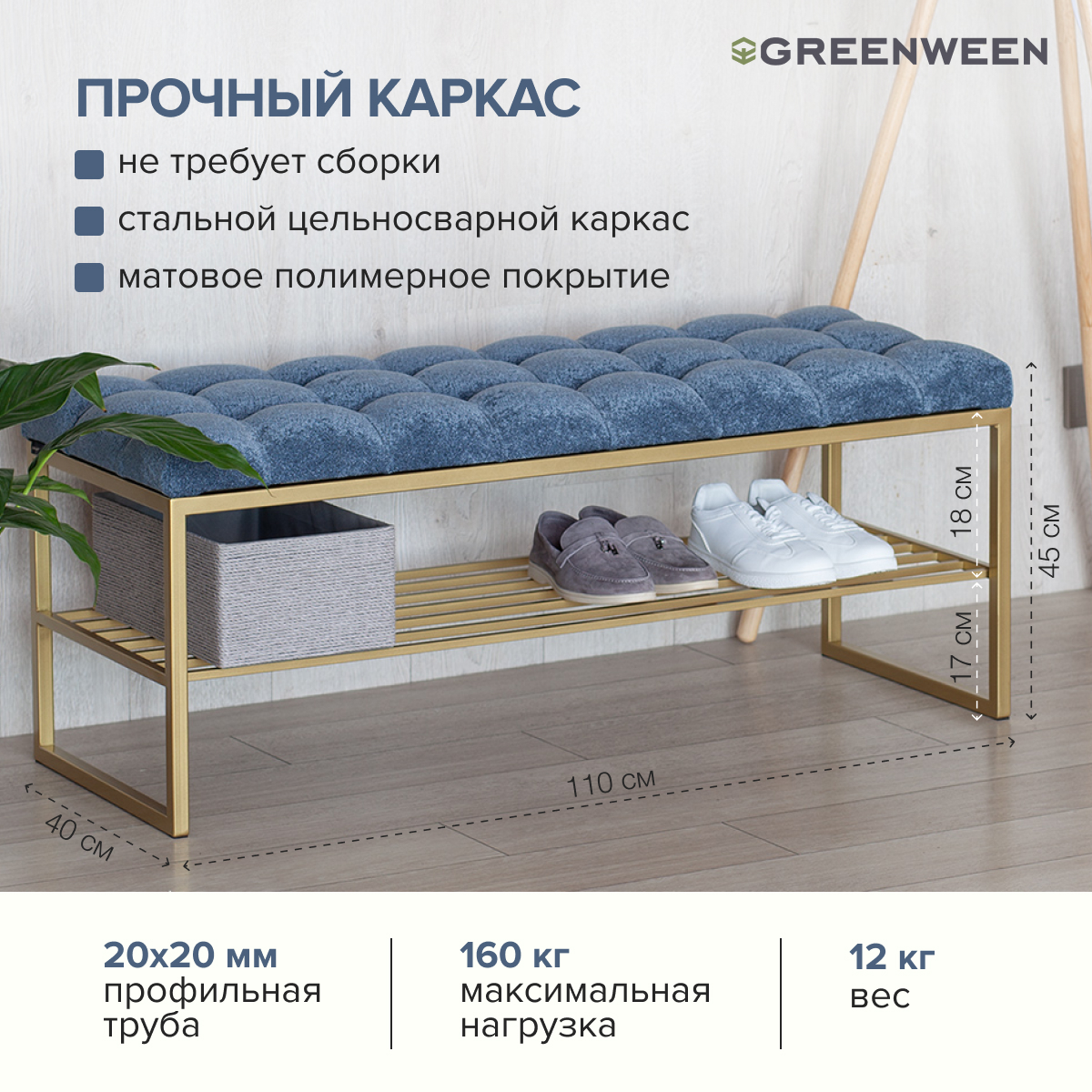 Размеры банкетки — 1100х400х450 мм. Каркас и полка для обуви выполнены из прочной профильной трубы. Мягкое сиденье обито микрошениллом в каретной стяжке.