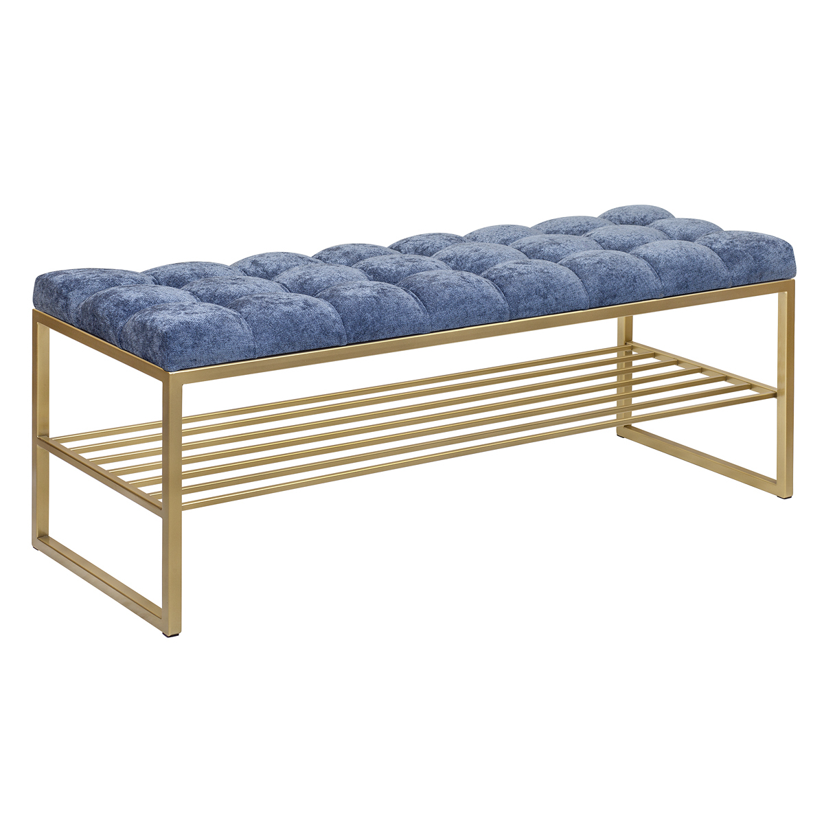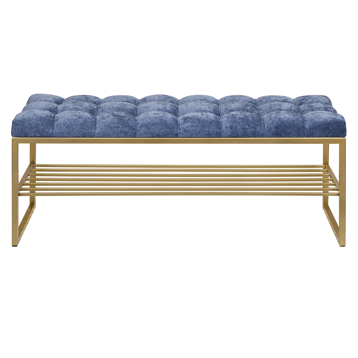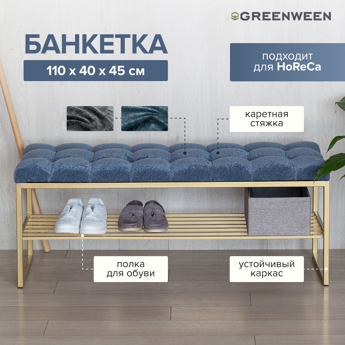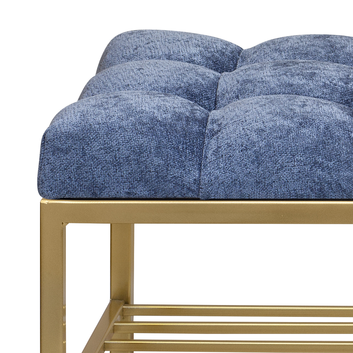 Банкетка RUBY — это стильный и функциональный предмет мебели. У нее золотое основание, мягкое сиденье и удобная полка для обуви.