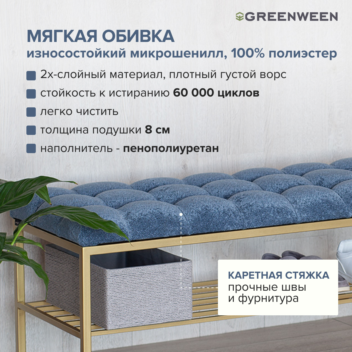 Банкетка с подушкой из микрошенилла отличается элегантным видом и комфортной посадкой. Мягкая обивка с высокой износостойкостью, прошла тест Мартиндейла — 60 000 циклов. Бархатистая ткань легко чистится от загрязнений, для ухода разрешена сухая и влажная чистка.