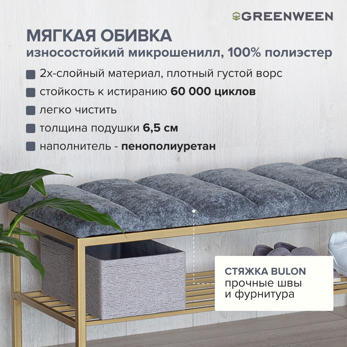 Размеры банкетки — 1100х400х435 мм. Каркас и полка для обуви выполнены из прочной профильной трубы. Мягкое сиденье обито микрошениллом в стяжке Bulon.