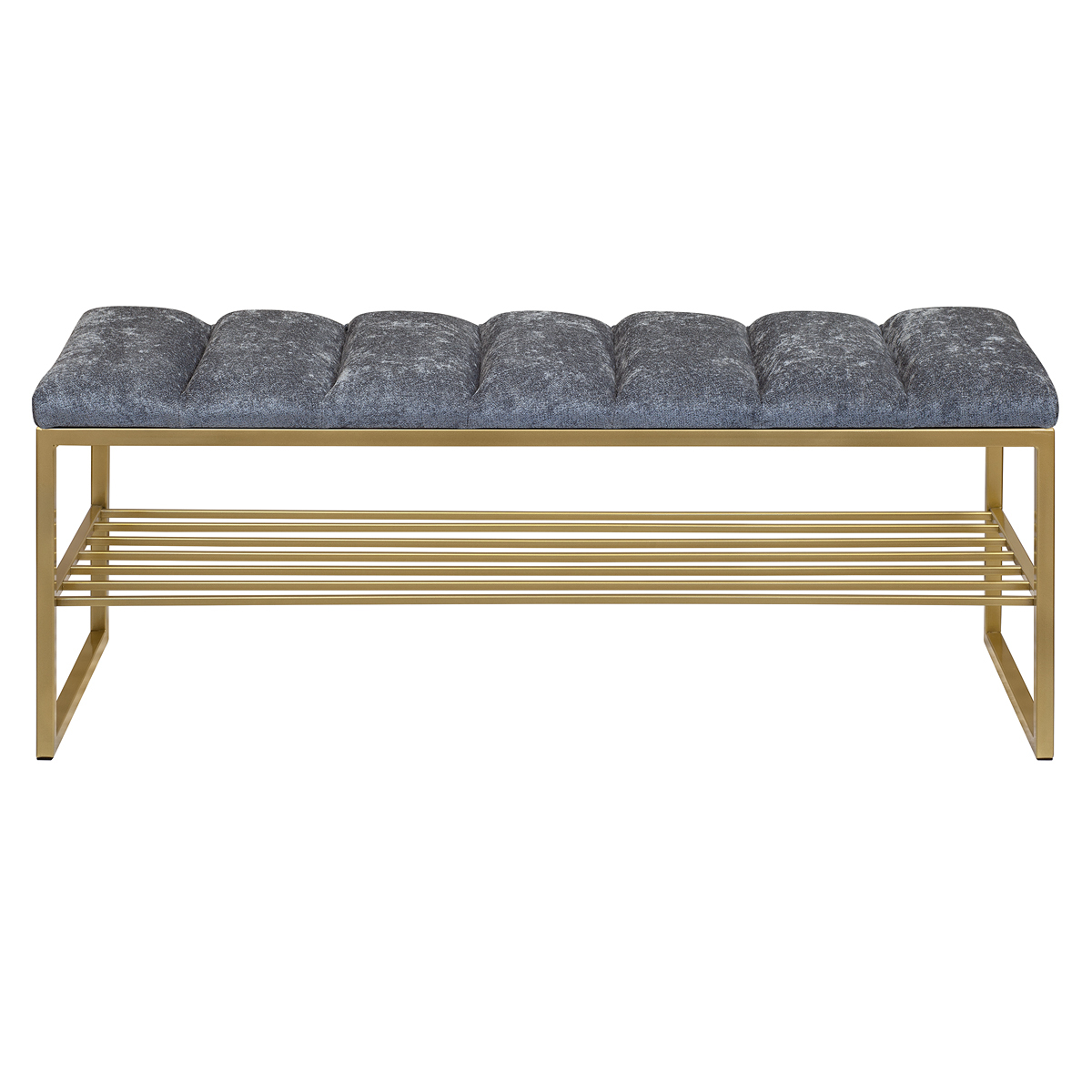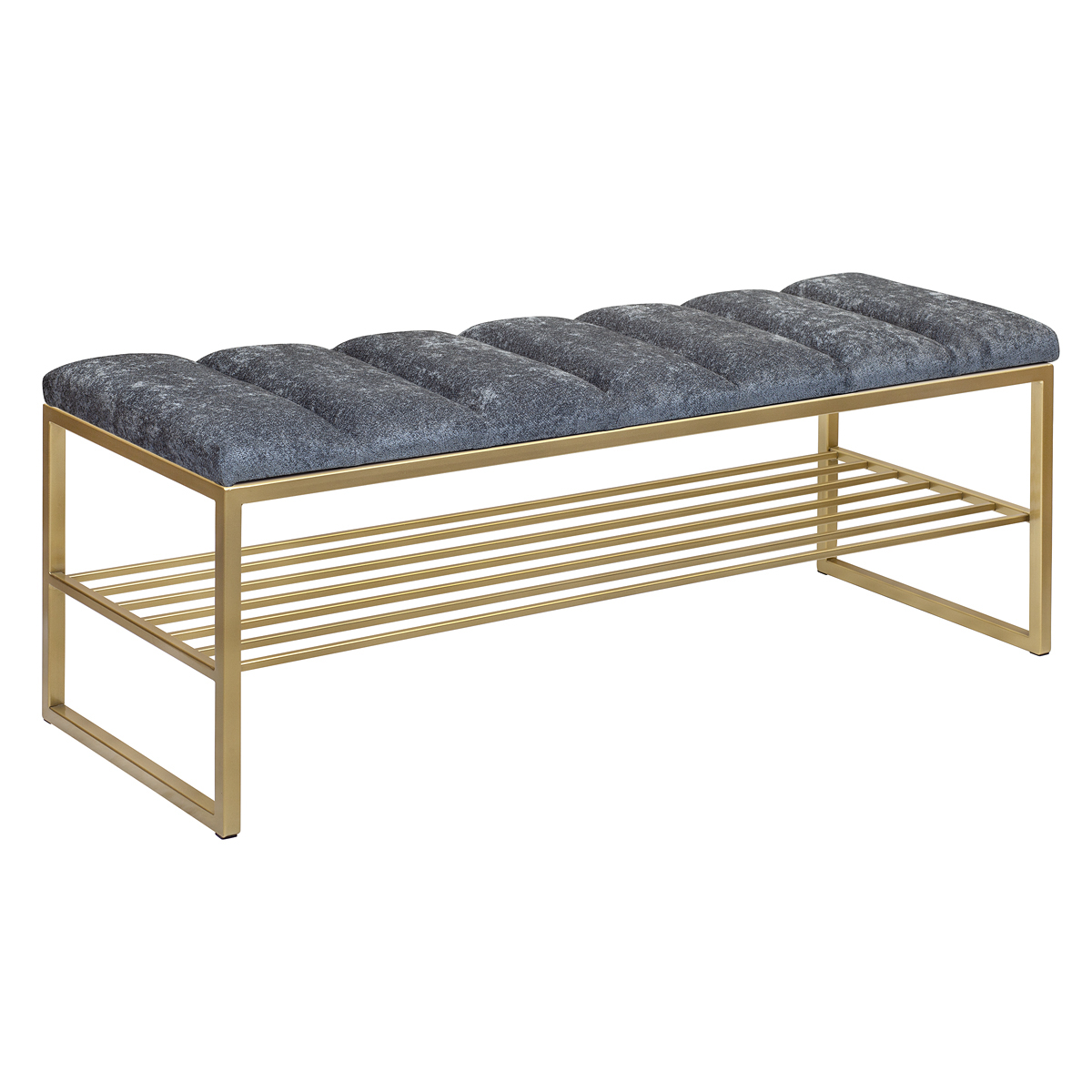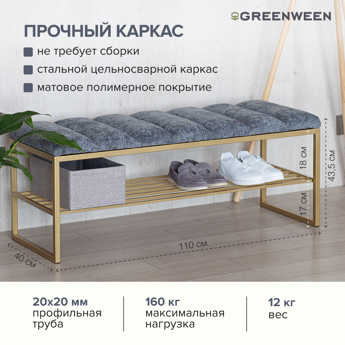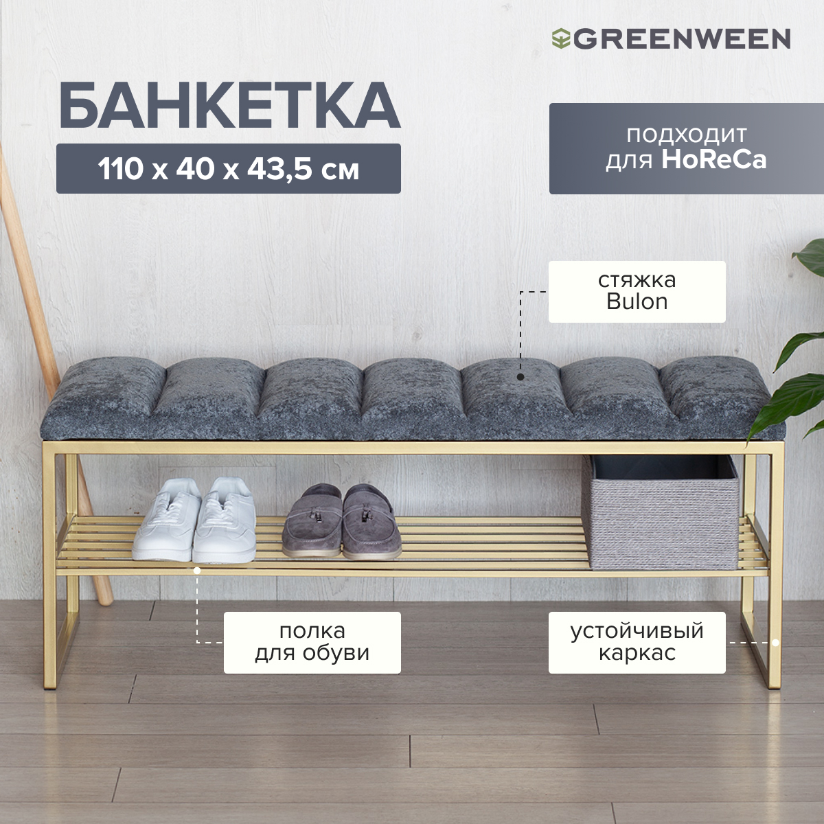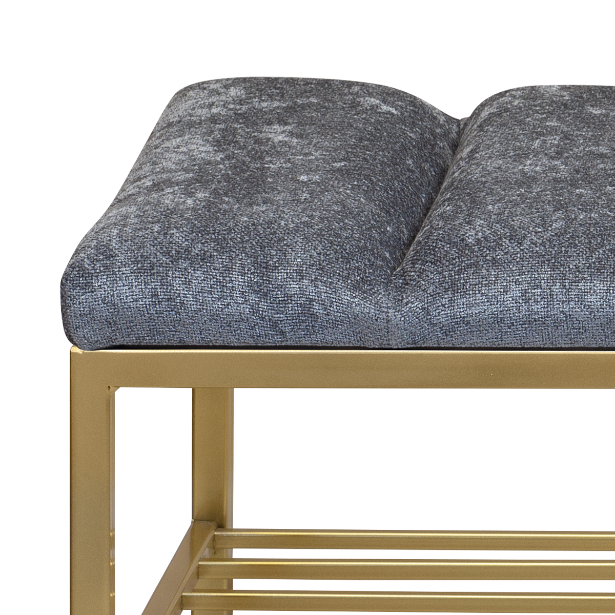 Банкетка RUBY — это стильный и функциональный предмет мебели. У нее золотое основание, мягкое сиденье и удобная полка для обуви.