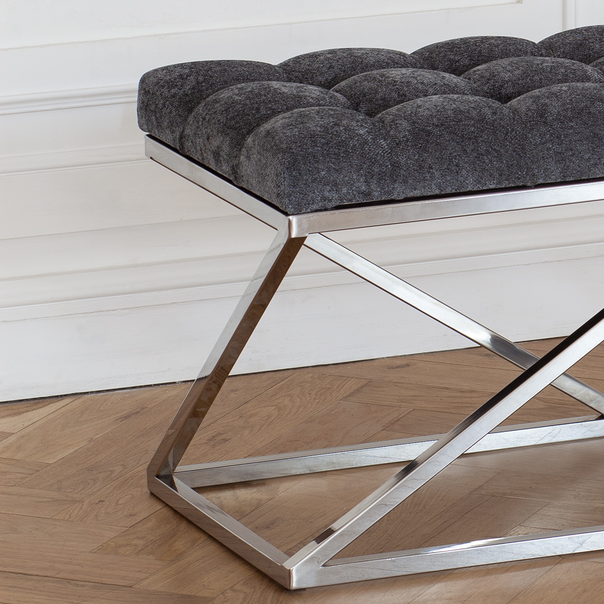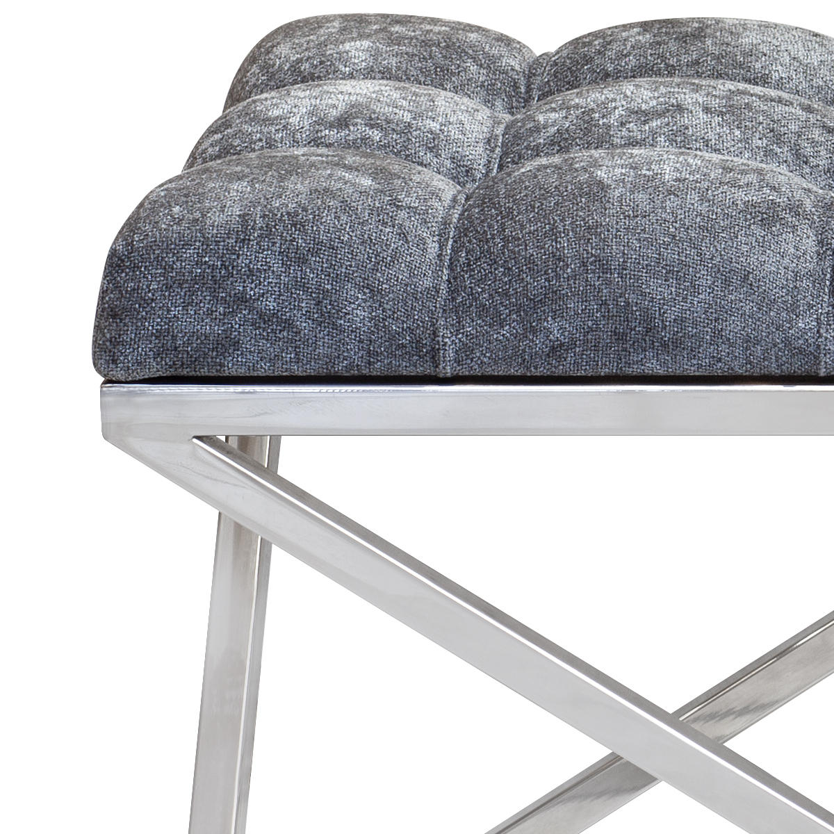 Банкетка ZUMA — это сочетание элегантности и комфорта. Основание из нержавеющей стали и мягкая подушка из микрошенилла в каретной стяжке создают изысканный образ.