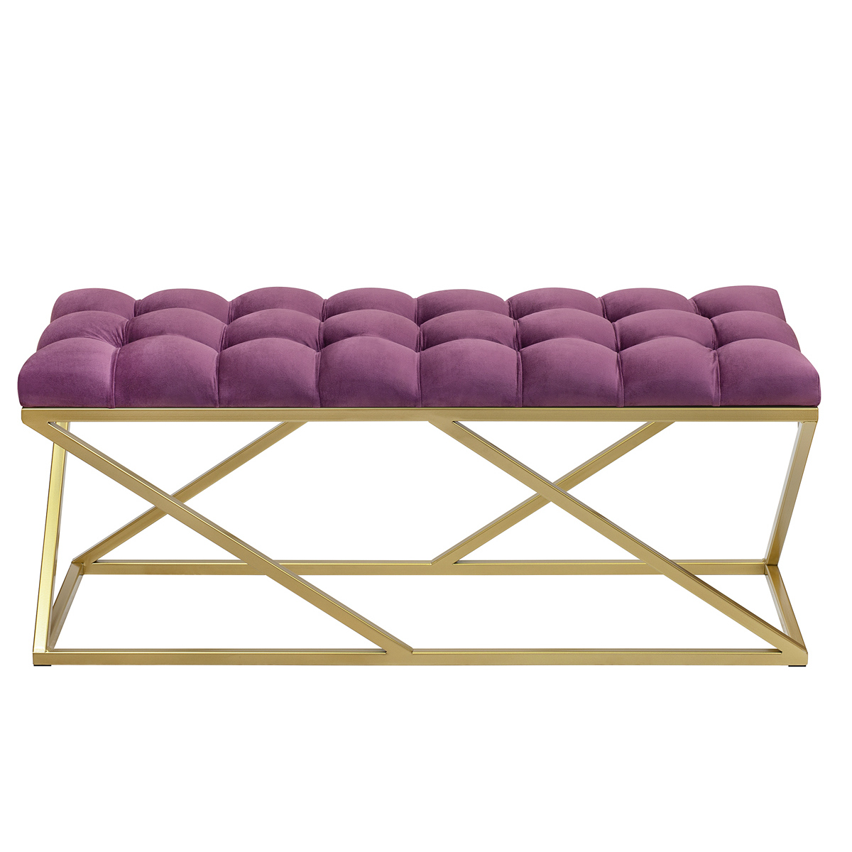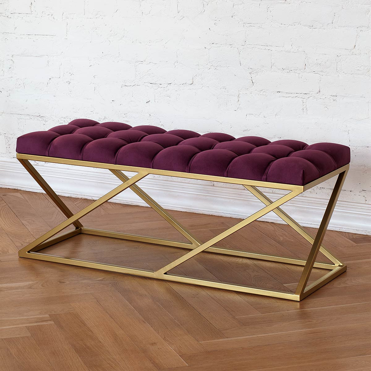 Банкетка ZUMA — это сочетание элегантности и комфорта. Золотистое основание и мягкая велюровая подушка в каретной стяжке создают изысканный образ.