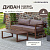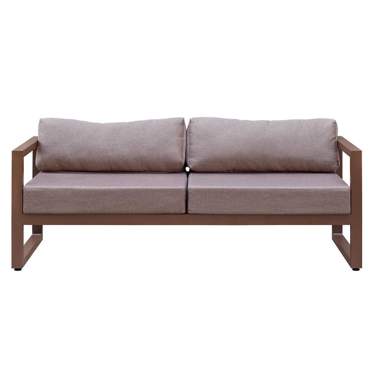 Габариты дивана с подушками 1900х755х770 мм, габариты каркаса 1900х755х665 мм. Каркас выполнен из алюминия с толщиной стенок 3 мм, 4 подушки коричневого цвета, Чехлы подушек выполнены из рогожки, 100% полиэстер, плотность 300 г/кв.м, устойчивость к истиранию более 100 000 циклов. Размеры подушек 890х710x150 мм и 890х190х300 мм, набивка большей подушки поролон, подушка для спины набита синтепоном, упакованы в несъёмный чехол из спанбонда. Регулируемые ножки с пластиковым основанием. Высота от пола до сидения (металл) 320 мм, высота от пола до сидения подушки 470 мм. Вес алюминиевого каркаса дивана 23,5 кг, подушки весят по 2,6 и 3,1 кг пара. Максимальная нагрузка на диван 300 кг.