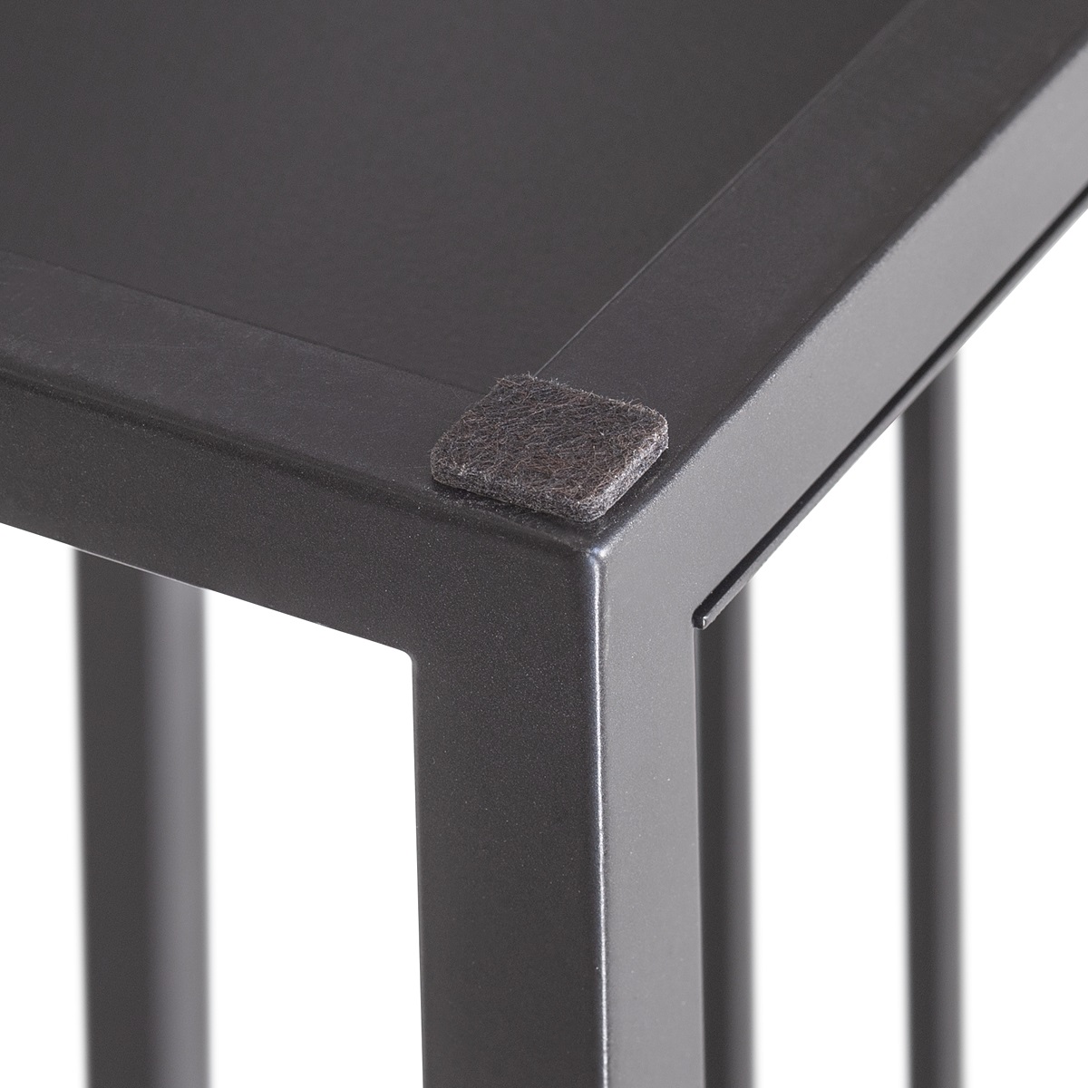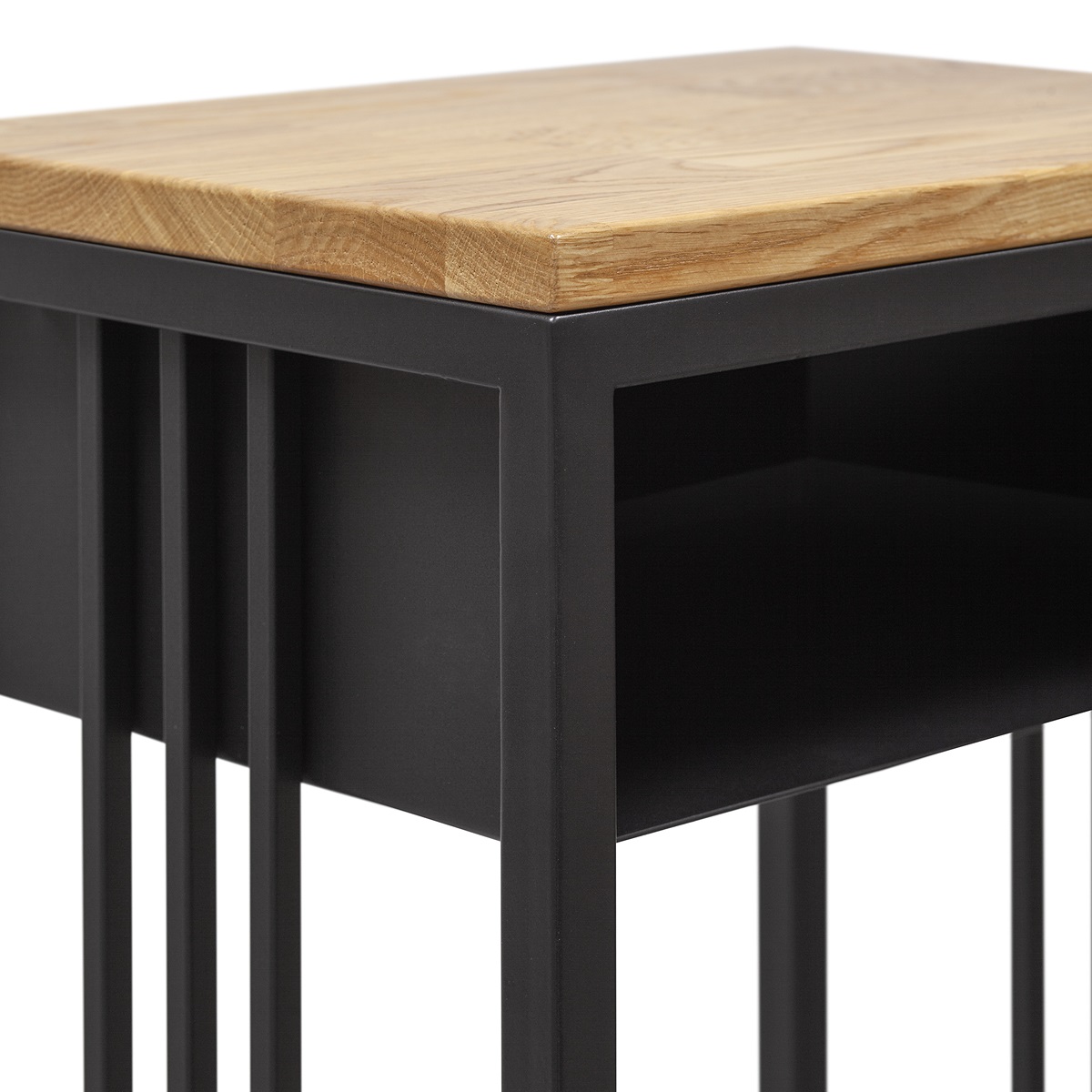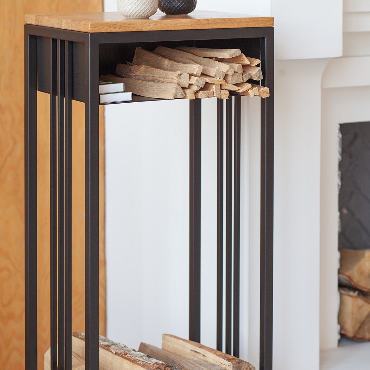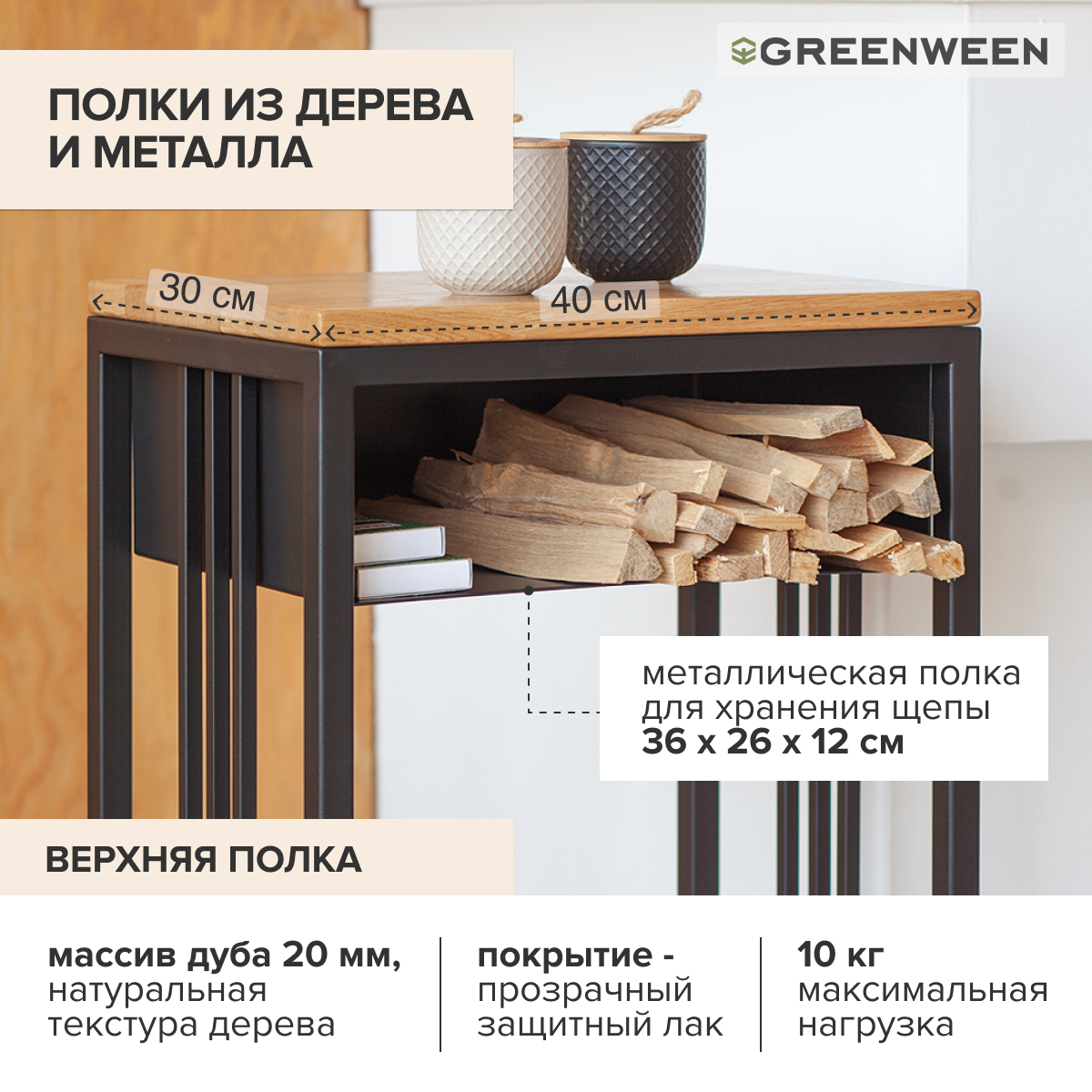 Прочный цельносварной каркас изготовлен из профильной трубы 20х20 мм, покрытой порошковой краской. Столешница выполнена из массива дуба толщиной 20 мм, покрыта прозрачным лаком для защиты от воды. На металлической полке удобно хранить щепу для розжига, спички, они всегда будут под рукой, когда вы разводите огонь в камине.