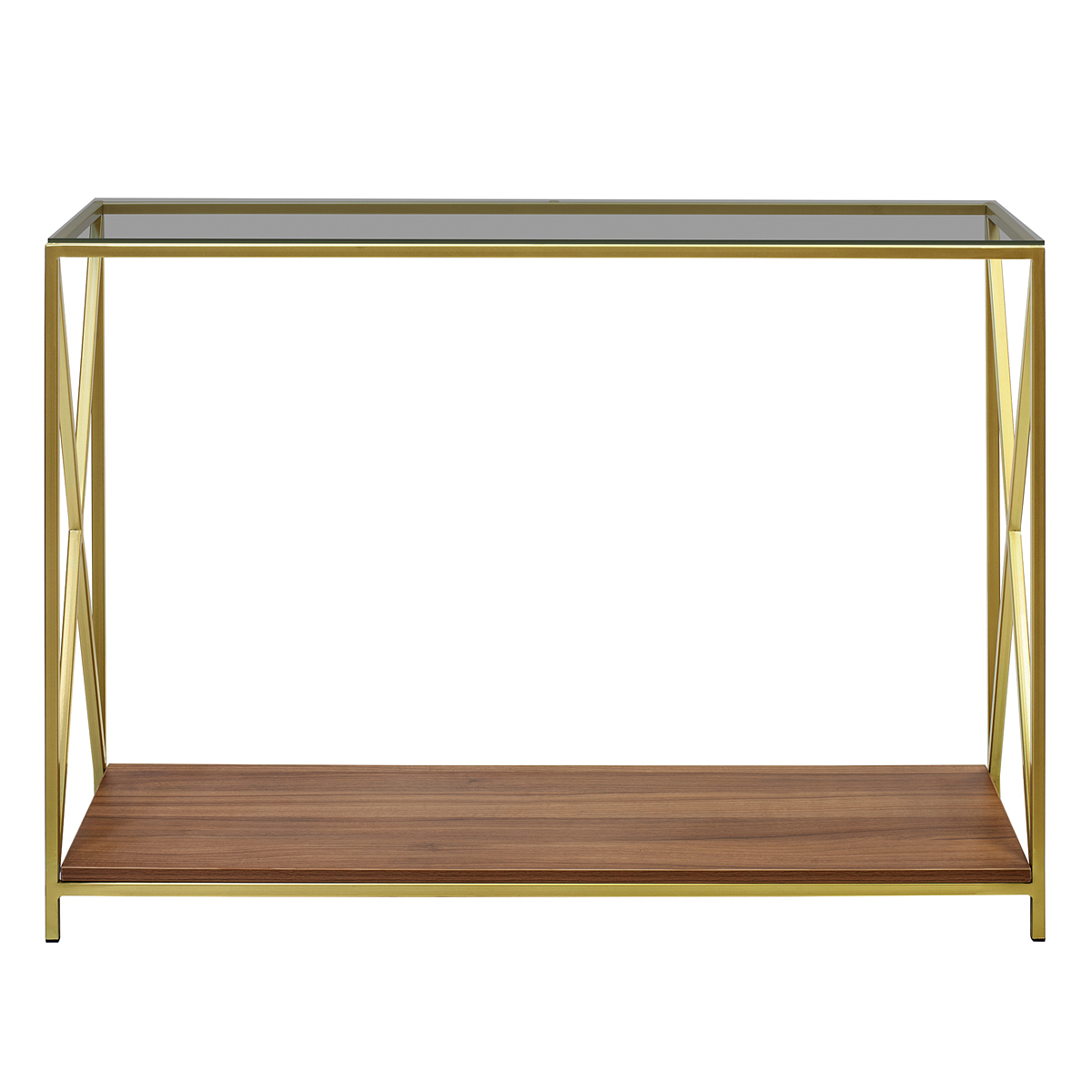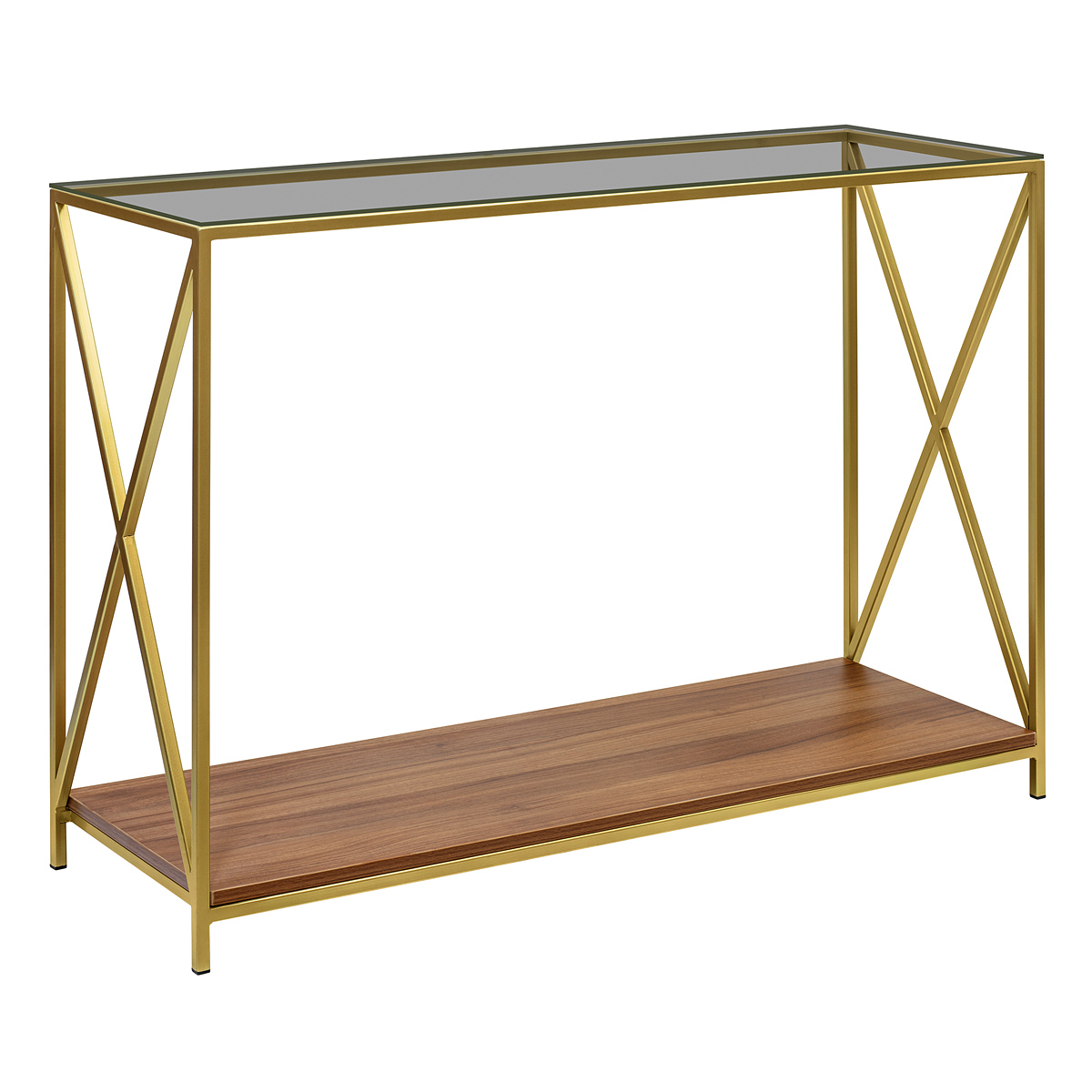 Золотая консоль GARDA с полкой из ЛДСП Орех и стеклянной столешницей подойдет для зонирования гостиной, спальни и входной зоны.