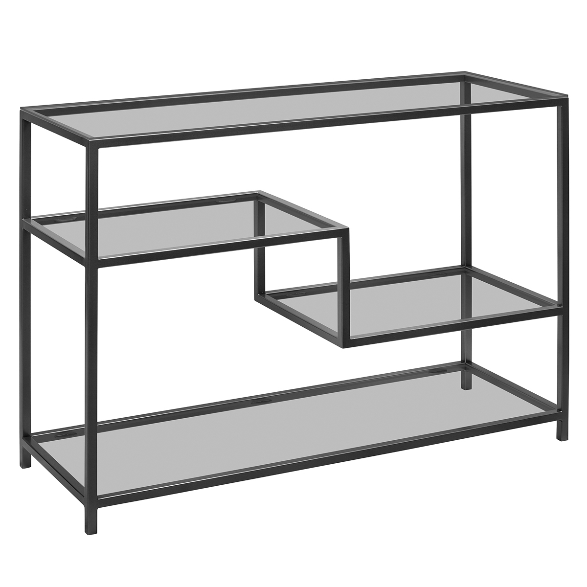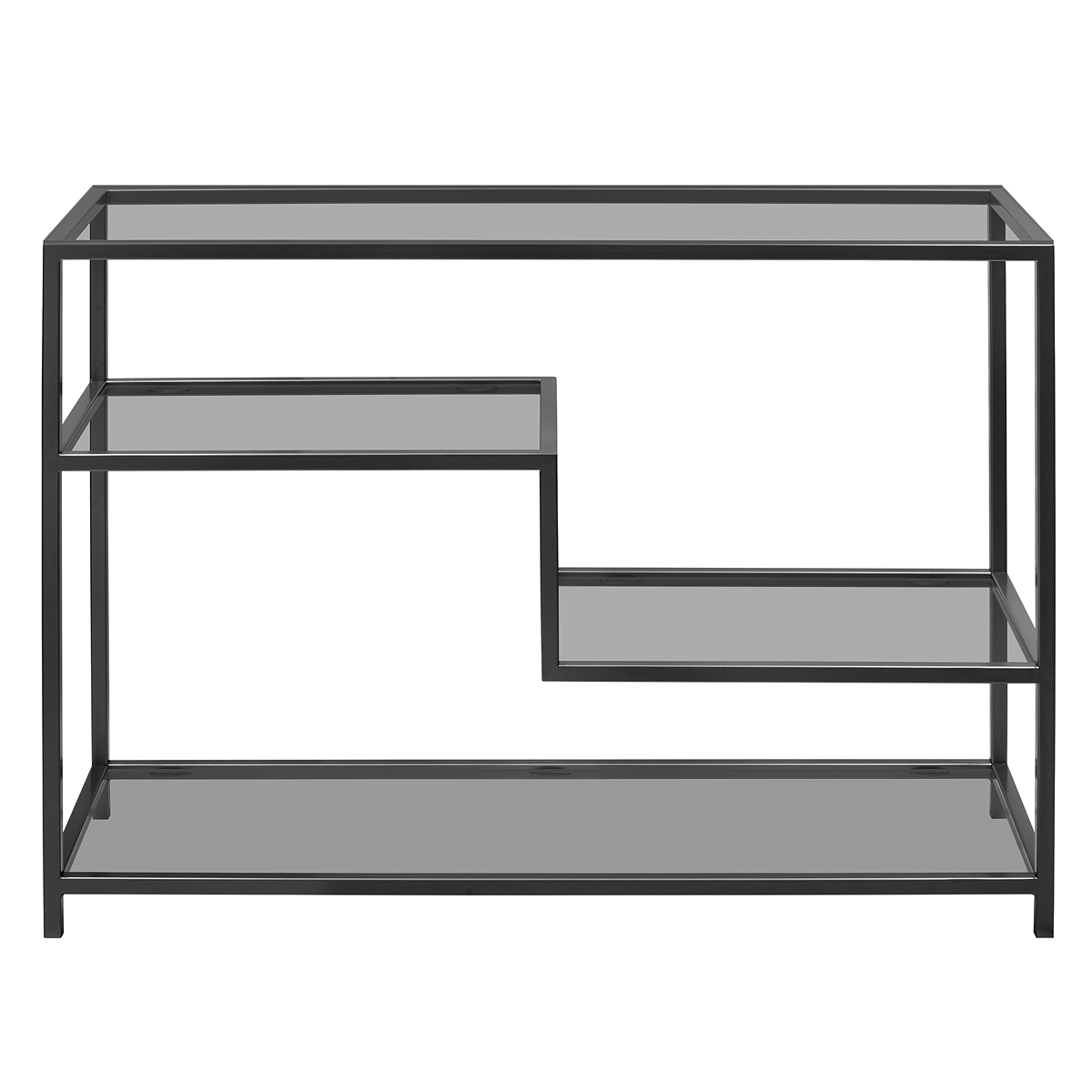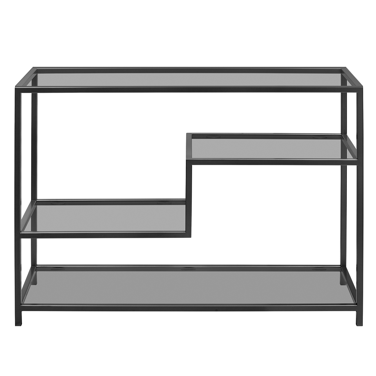 Черная консоль JAQLENE с металлическим каркасом и полками из тонированного стекла подойдет для зонирования гостиной, спальни и входной зоны. Стильная консоль в прихожую дополнит интерьер квартиры, офиса, студии, салона и загородного дома.