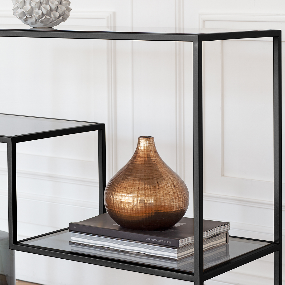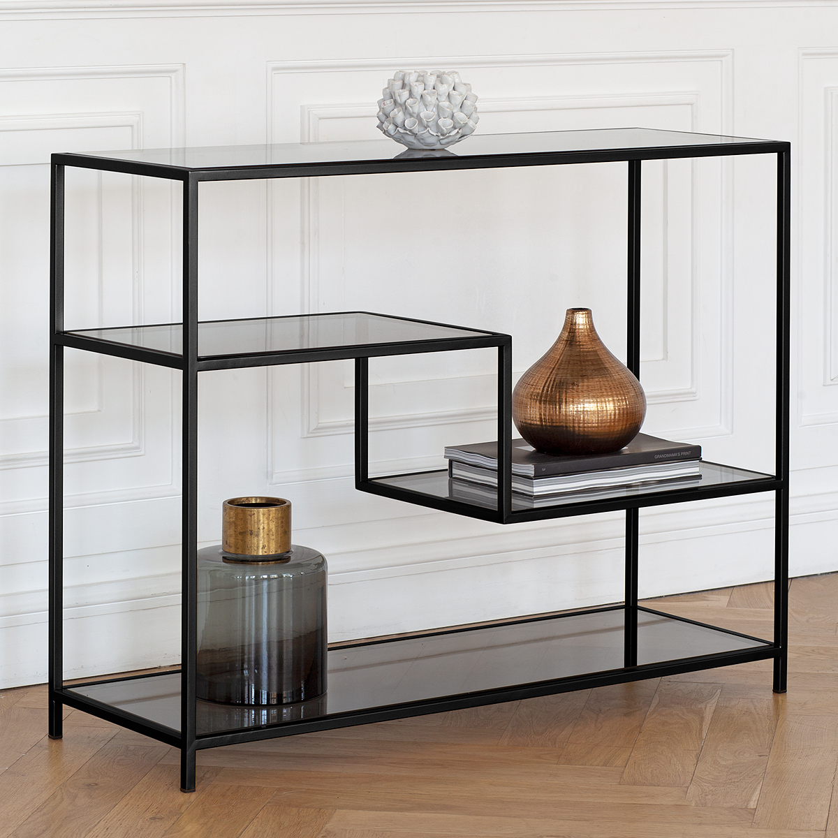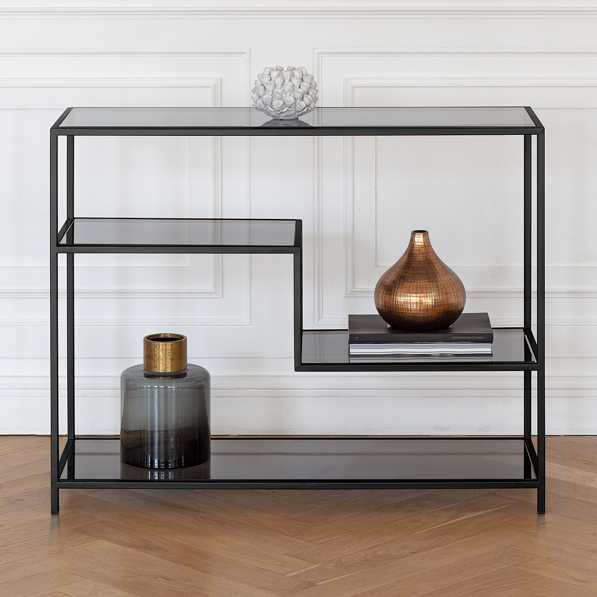 Черная консоль JAQLENE с металлическим каркасом и полками из тонированного стекла подойдет для зонирования гостиной, спальни и входной зоны. Стильная консоль в прихожую дополнит интерьер квартиры, офиса, студии, салона и загородного дома.