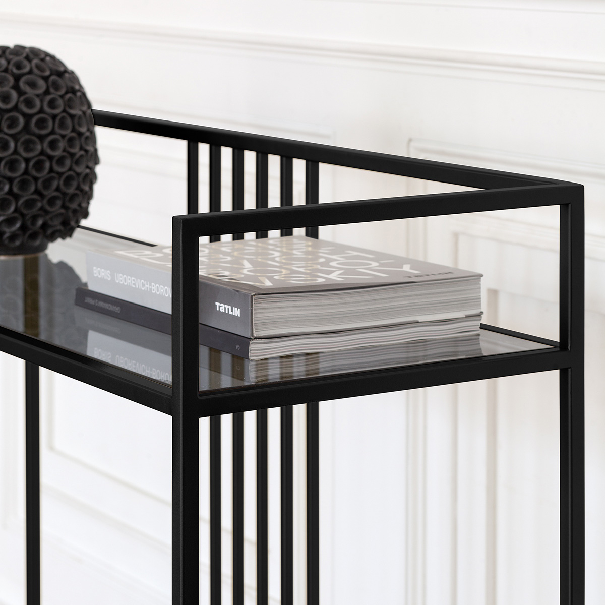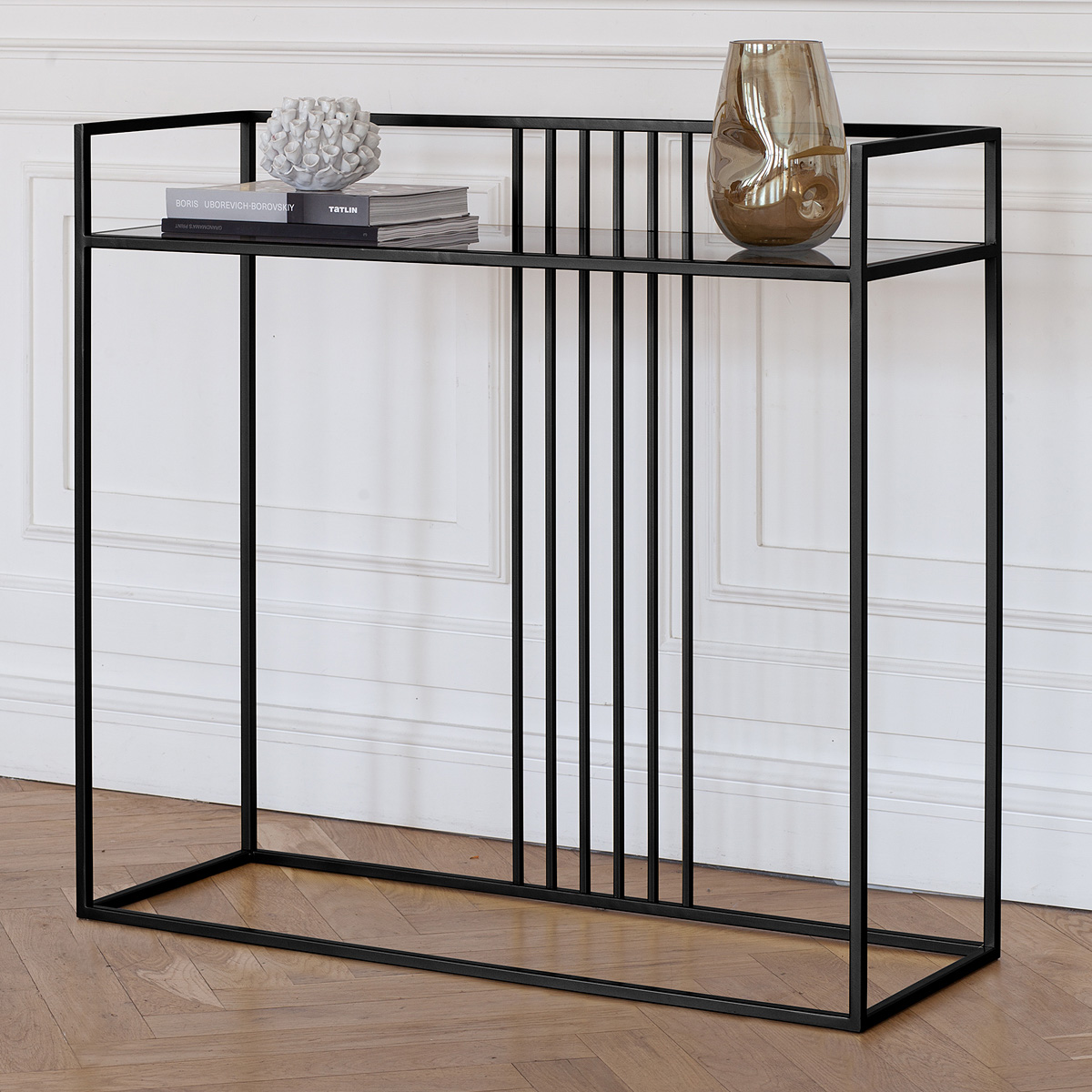 Консоль SOHO привлекает внимание стильным дизайном и лаконичной формой. Черный каркас с вертикальными элементами дополняет полка из тонированного стекла. Стильная консоль подойдет для входной зоны, спальни, гостиной и кабинета.
