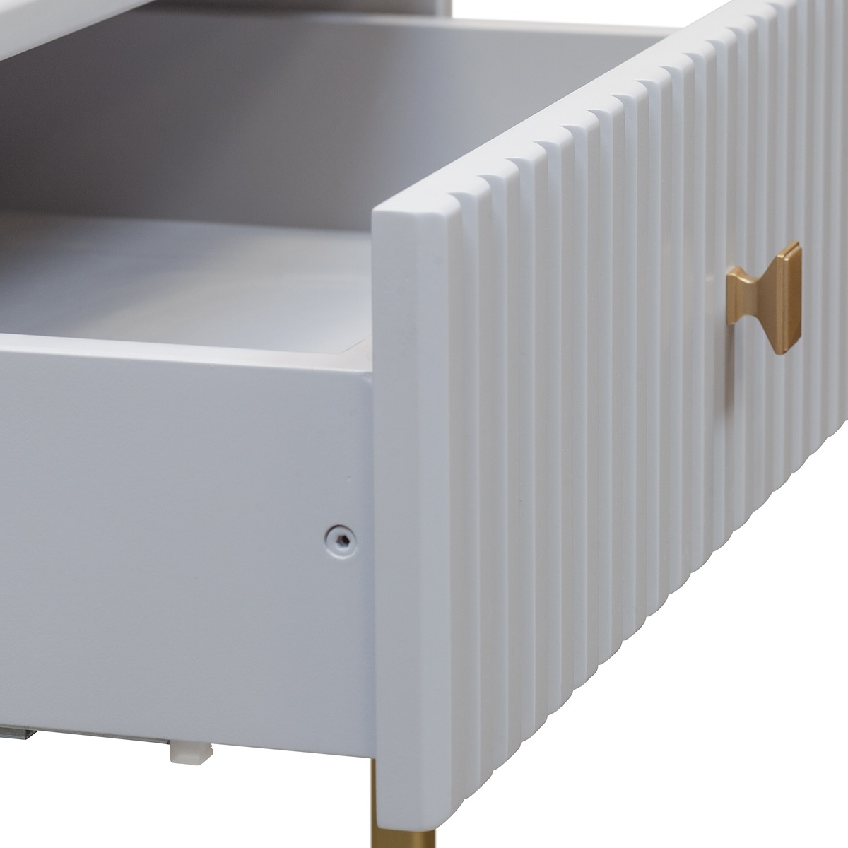 Корпус и внутренние ящики консоли изготовлены из МДФ повышенной плотности толщиной 16 мм. Поверхность окрашена эмалью жемчужно-серого оттенка с матовой текстурой. Декоративные фасады консоли с вертикальными полосами выполнены из МДФ способом фрезеровки. Преимущества фасада из МДФ: повышенная износостойкость, высокая прочность и устойчивость к царапинам, отсутствие отпечатков пальцев на поверхности, легкость в уходе.