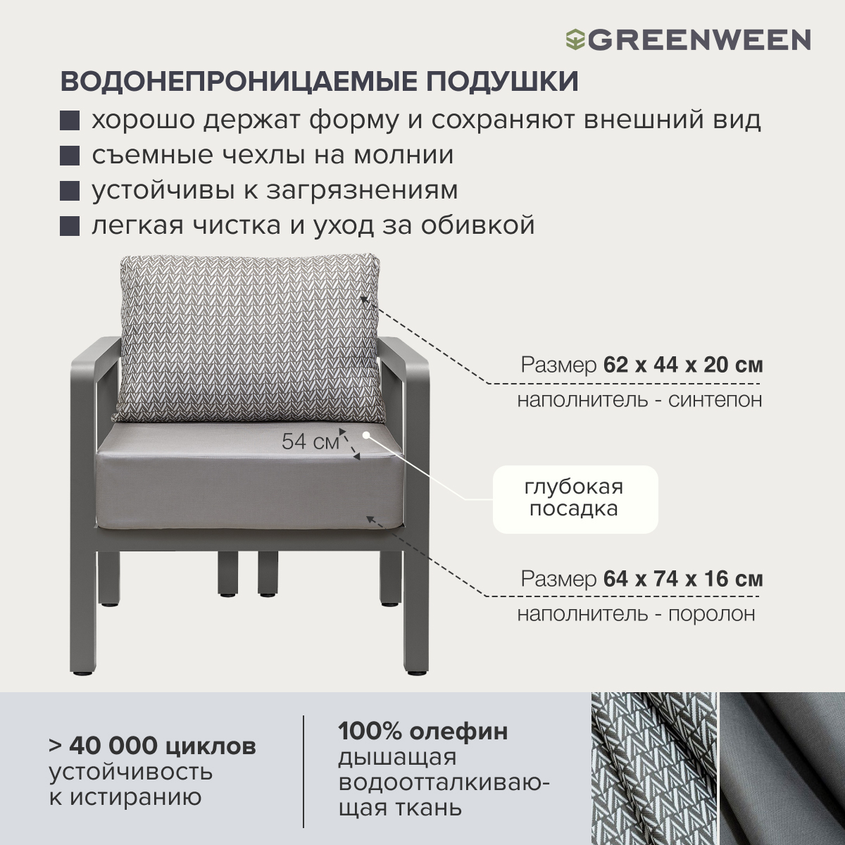 Садовое кресло оснащено 2 мягкими подушками в съемных чехлах из водонепроницаемой ткани, 100% олефин. Дышащий материал устойчив к загрязнениям и воздействию воды, препятствует образованию пятен от напитков и лосьонов для загара, облегчает чистку и уход за обивкой.