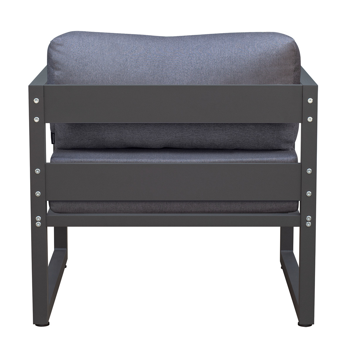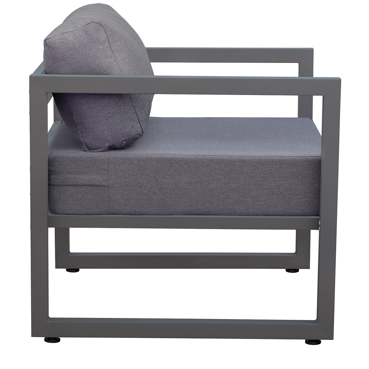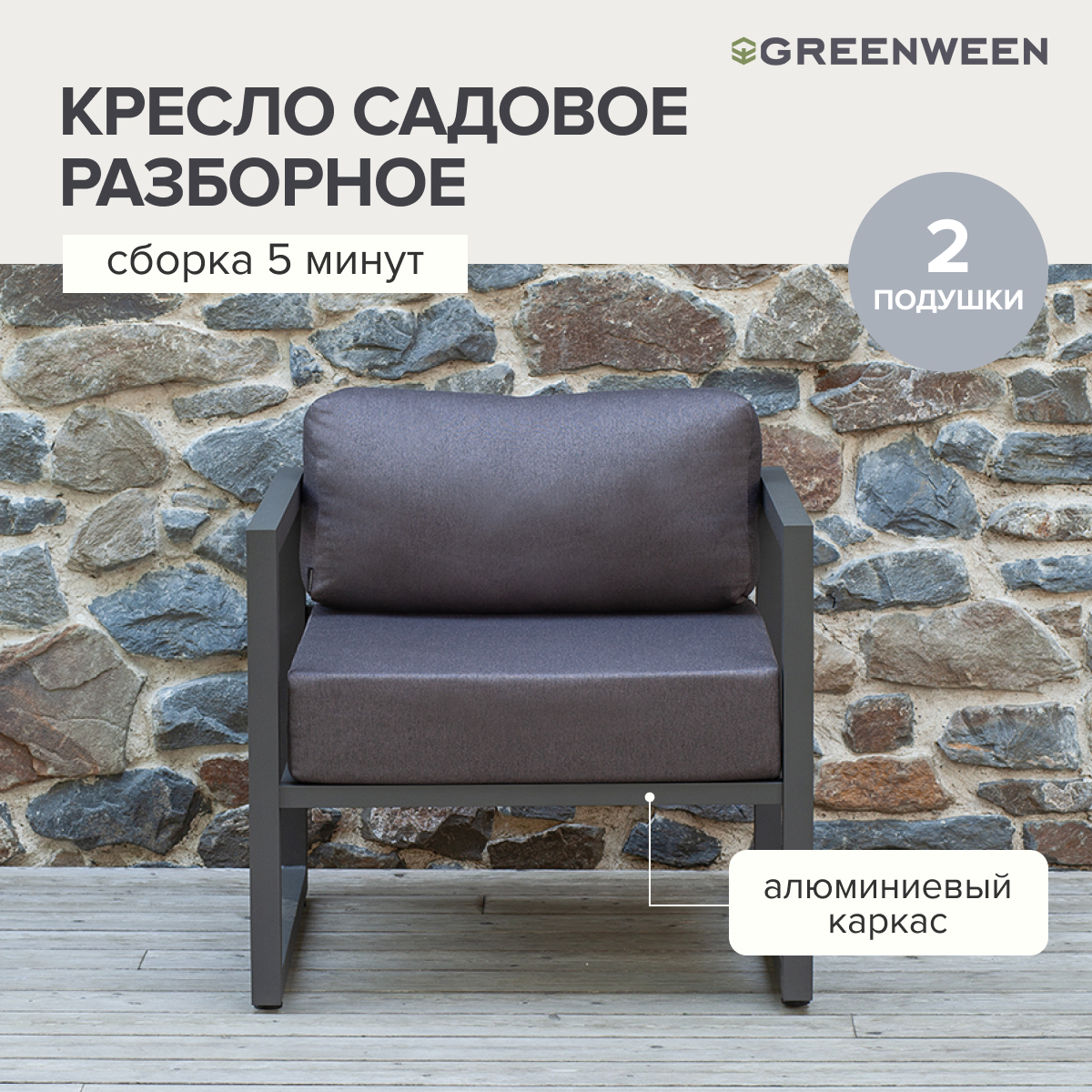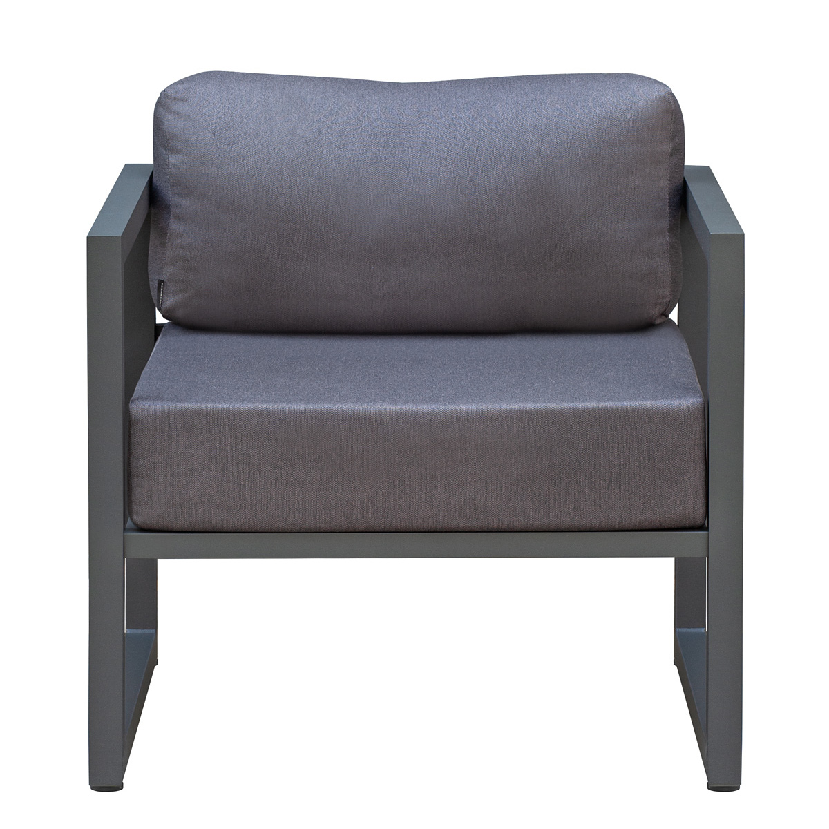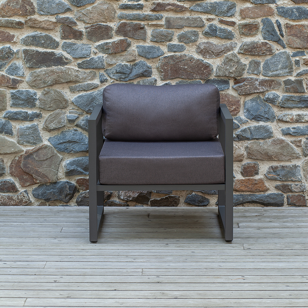 Габариты кресла с подушками 76х75х77 см, габариты каркаса 76х75х66 см. Каркас изготовлен из алюминиевой профильной трубы с полимерным покрытием темно-серого цвета. 2 подушки, размеры 66х70х15 и 66х19х30 см.