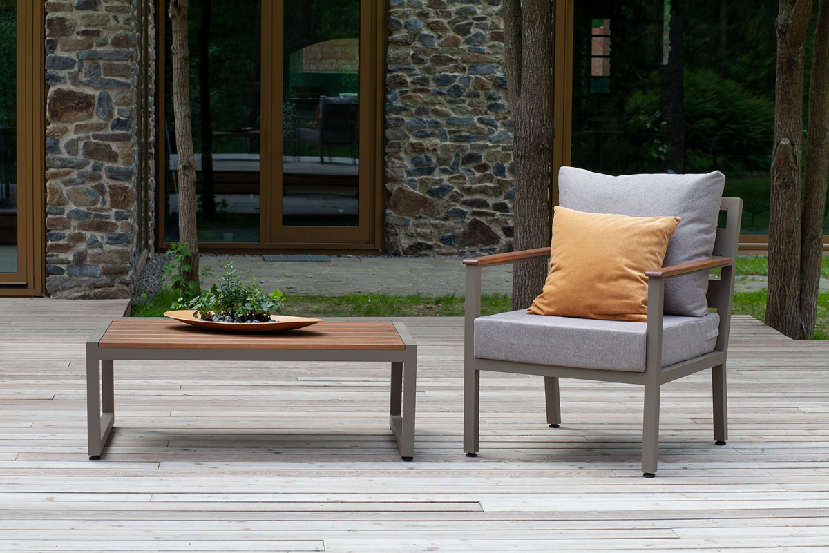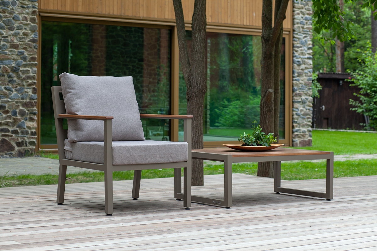 Уличное кресло из коллекции мебели SANTORINI сочетает в себе элегантный дизайн, комфорт и долговечность. Легкий алюминиевый каркас дополняют 2 удобные подушки со съемными чехлами. Садовое кресло с деревянными подлокотниками подходит для использования на улице и в помещении. Уличное кресло в комплекте с журнальным столиком и диваном создают комфортное пространство для отдыха в саду, на террасе, у бассейна.