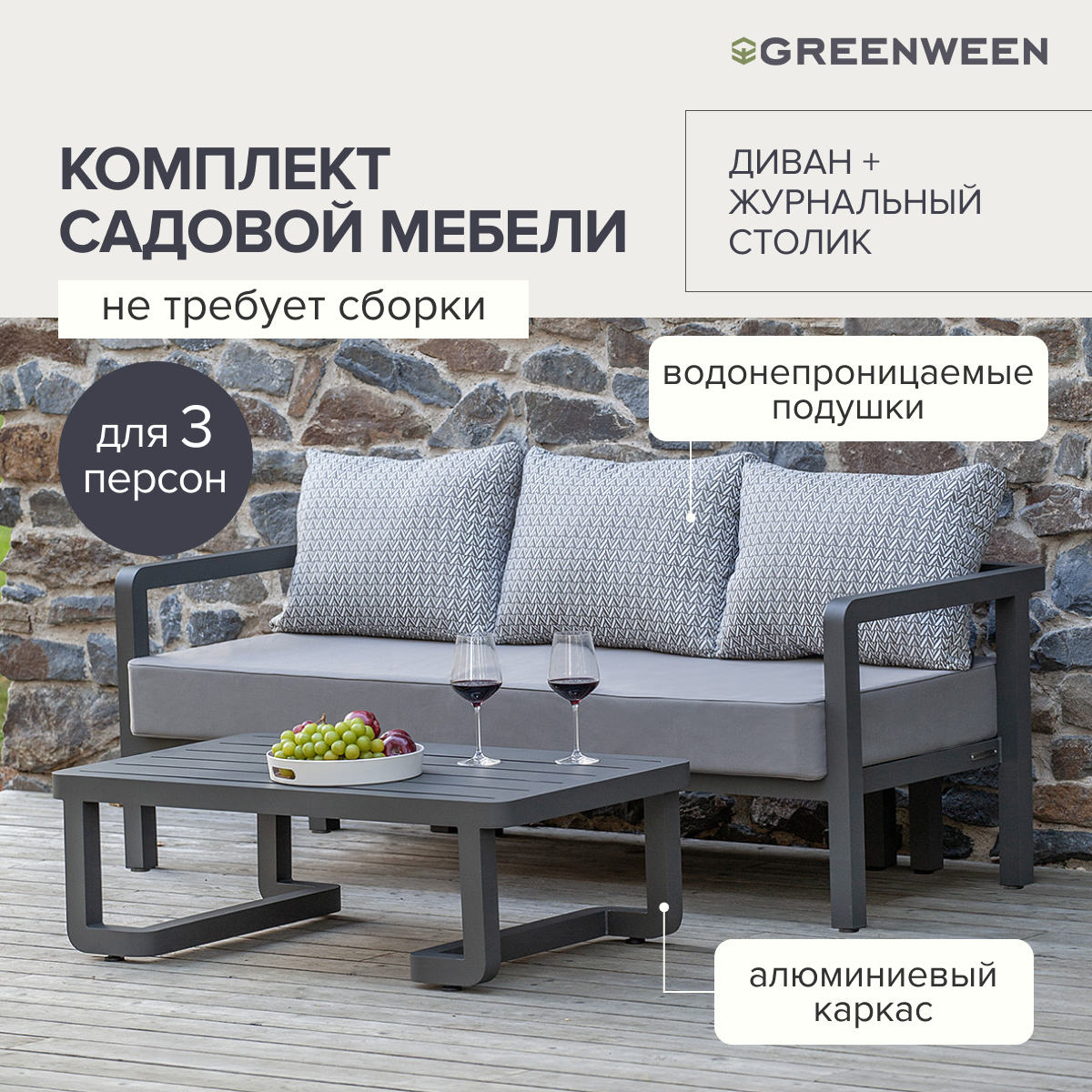 Набор садовой мебели AMALFI сочетает в себе современный дизайн, комфорт и долговечность. Комплект состоит из 2-х предметов: дивана и журнального столика, подойдет для размещения 3 персон.