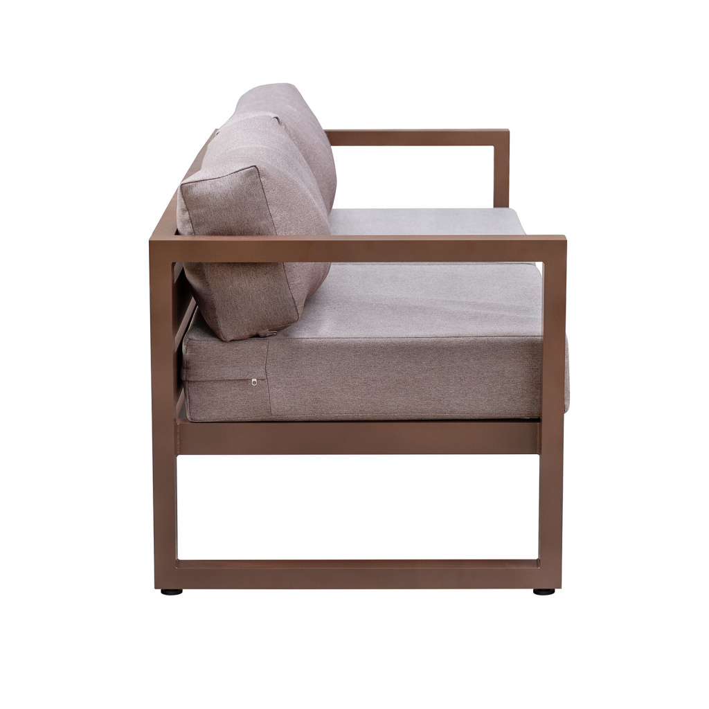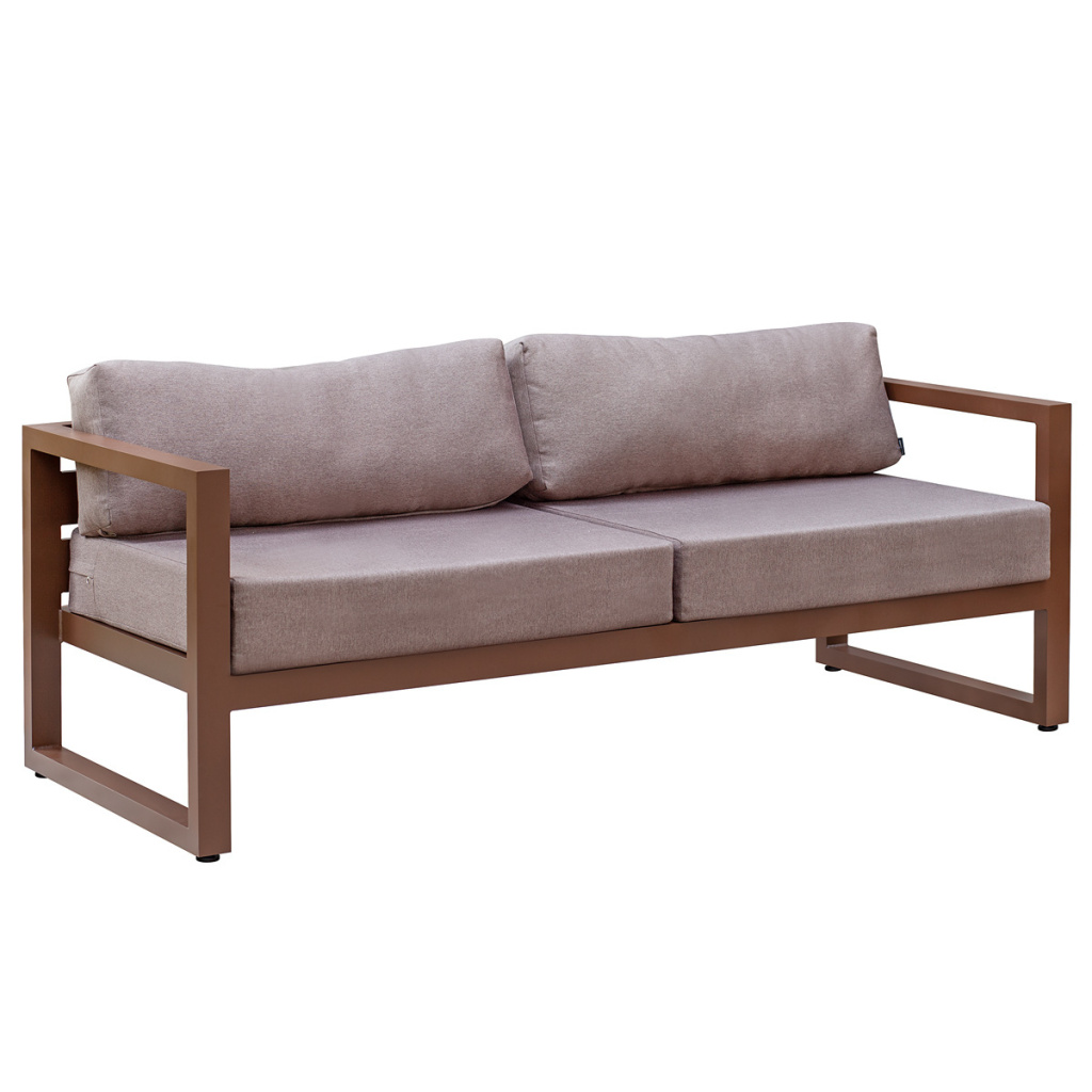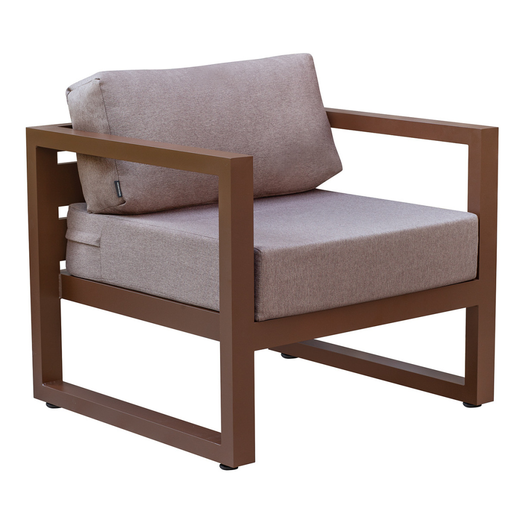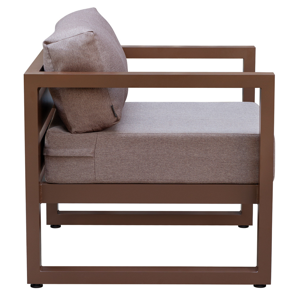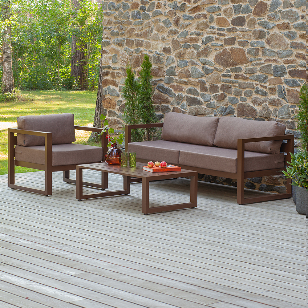 Комплект уличной мебели CAPRI создает комфортное пространство для отдыха в саду, на террасе, у бассейна. В наборе представлен диван, кресло и журнальный столик. Каркас изготовлен из высокопрочного алюминия, на сиденьях предусмотрены удобные подушки коричневого оттенка.