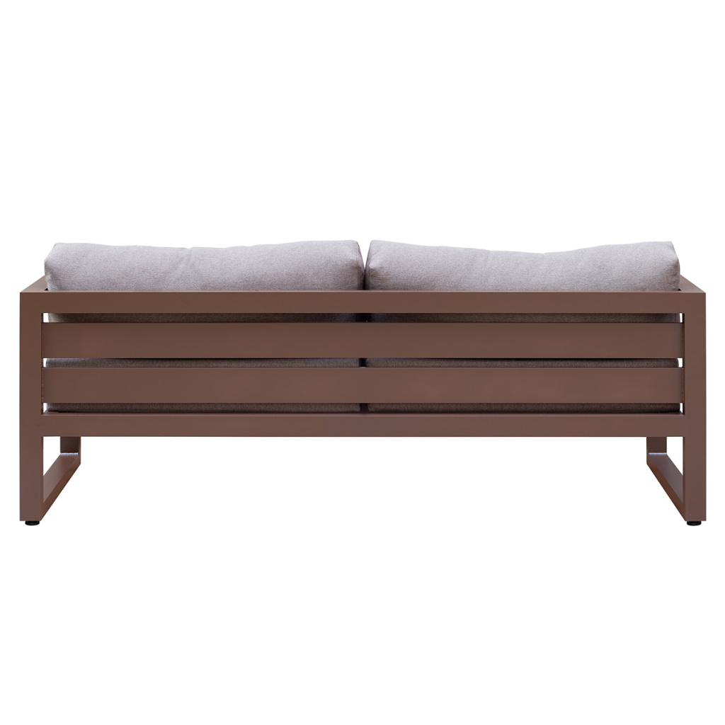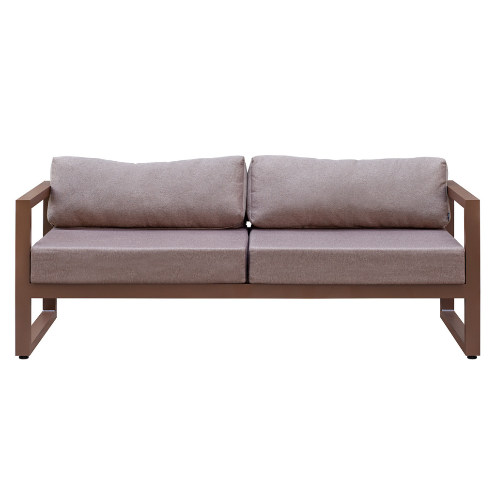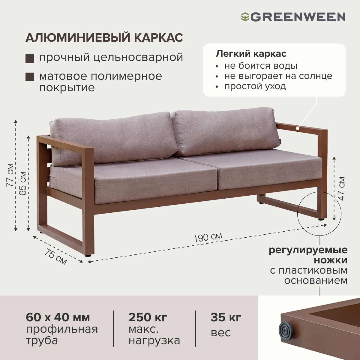 Каркас мебели изготовлен из алюминиевой профильной трубы 60х40 мм на высокоточном лазерном оборудовании. Металлическое основание с матовым полимерным покрытием коричневого цвета характеризуется повышенной прочностью, устойчивостью к царапинам. Профессиональная порошковая покраска надолго сохранит внешний вид мебели. Регулируемые по высоте ножки позволяют устанавливать мебель на неровной поверхности.