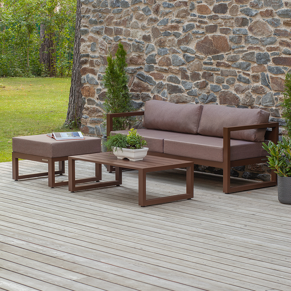 Комплект уличной мебели CAPRI создает комфортное пространство для отдыха в саду, на террасе, у бассейна. В наборе представлены диван, пуф и журнальный столик. Каркас мебели выполнен из высокопрочного алюминия, на сиденьях предусмотрены удобные подушки коричневого оттенка.