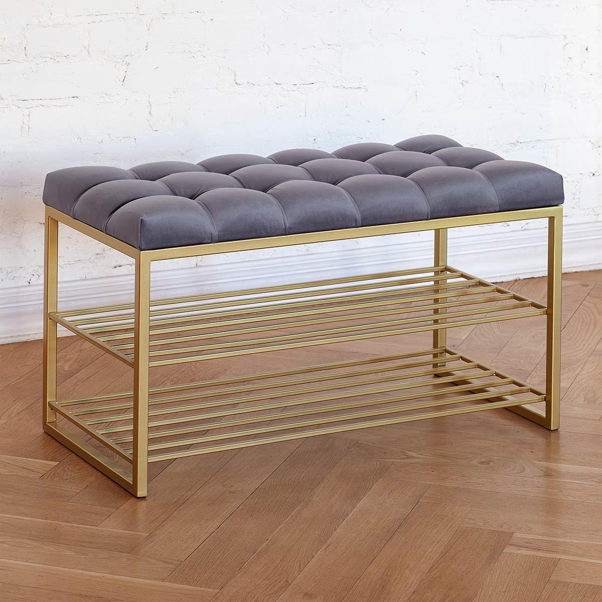 Обувница GARDA с золотистым основанием и велюровой подушкой с каретной стяжкой — стильная и функциональная мебель для прихожей, гостиной или кабинета. Компактная банкетка не займет много места, но обеспечит удобство благодаря двум полкам и мягкой скамье.
