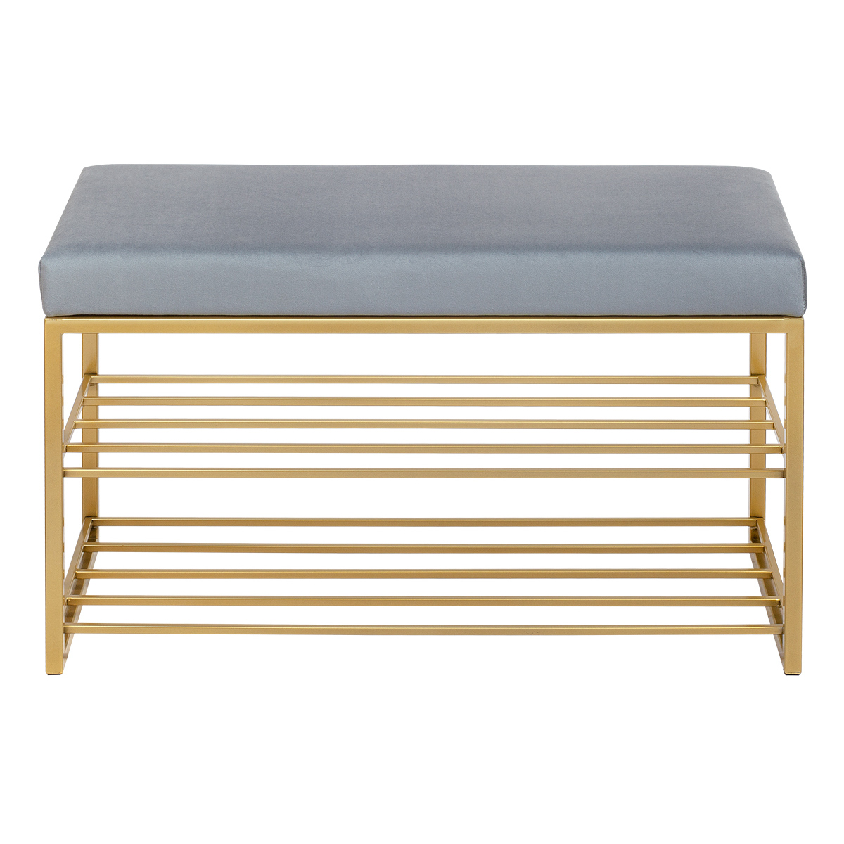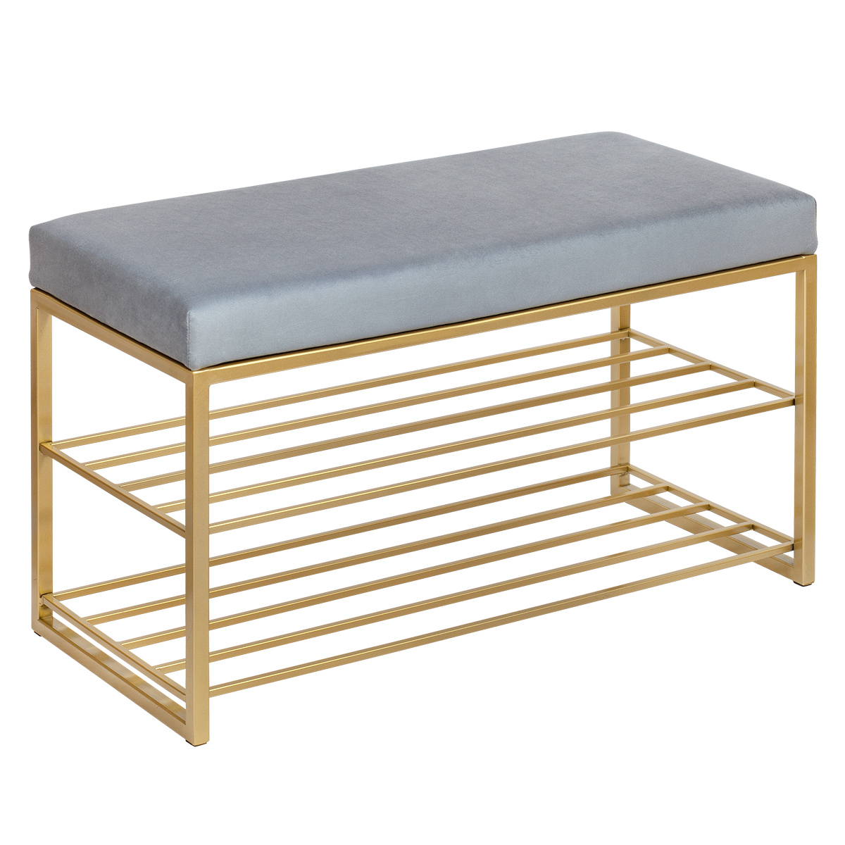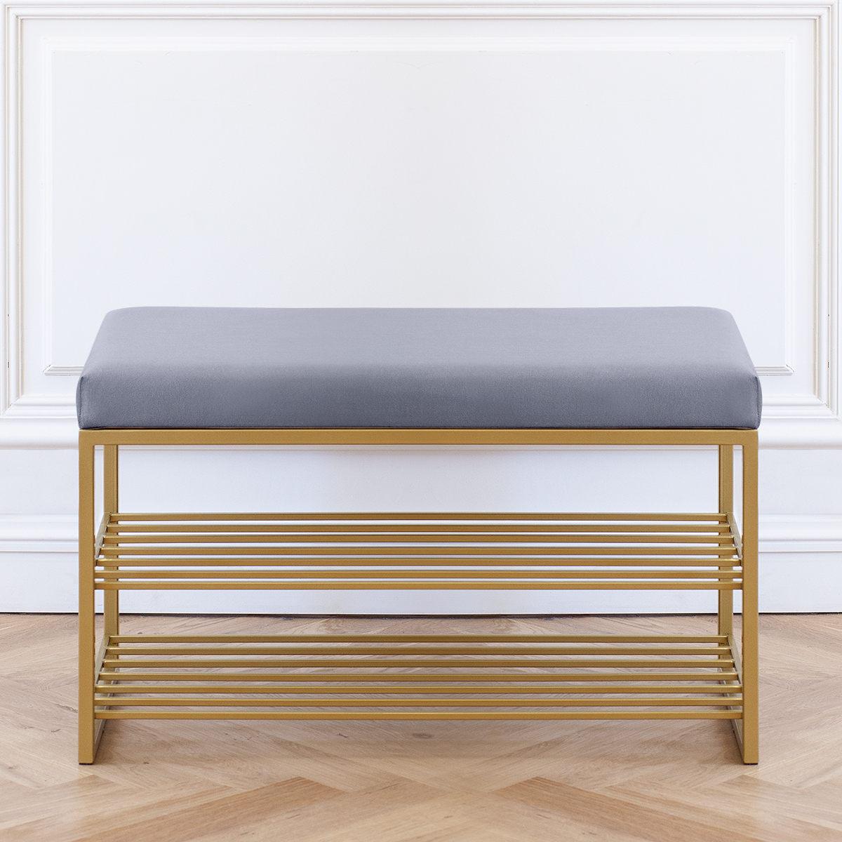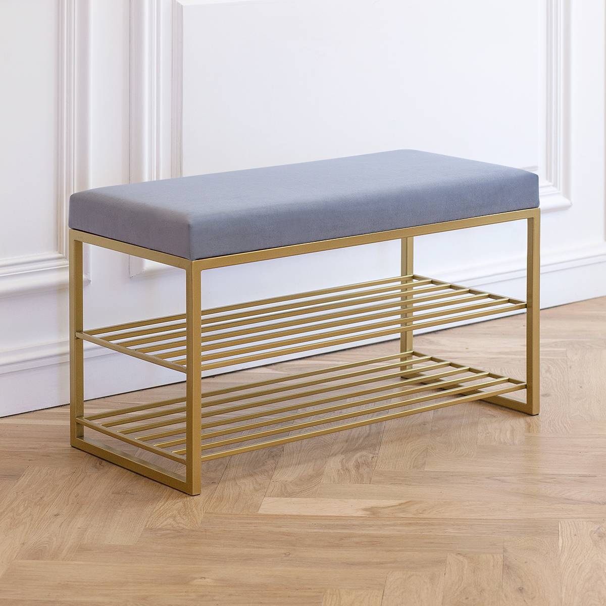 Обувница GARDA с золотистым основанием и велюровой подушкой — стильная и функциональная мебель для прихожей, гостиной или кабинета. Компактная банкетка не займет много места, но обеспечит удобство благодаря двум полкам и мягкой скамье.