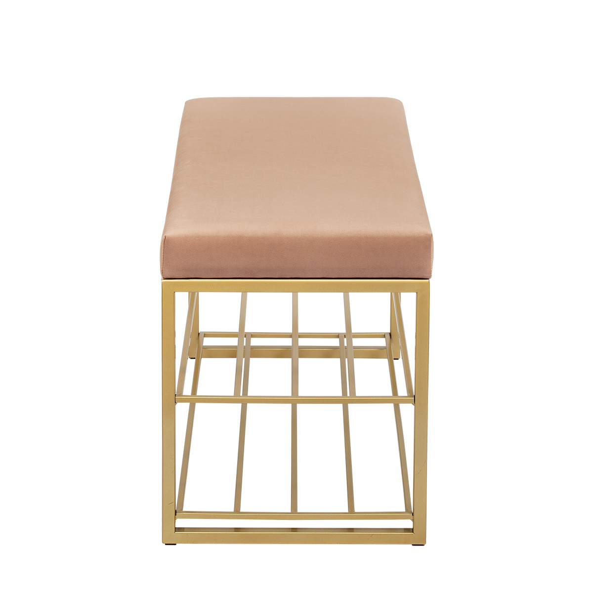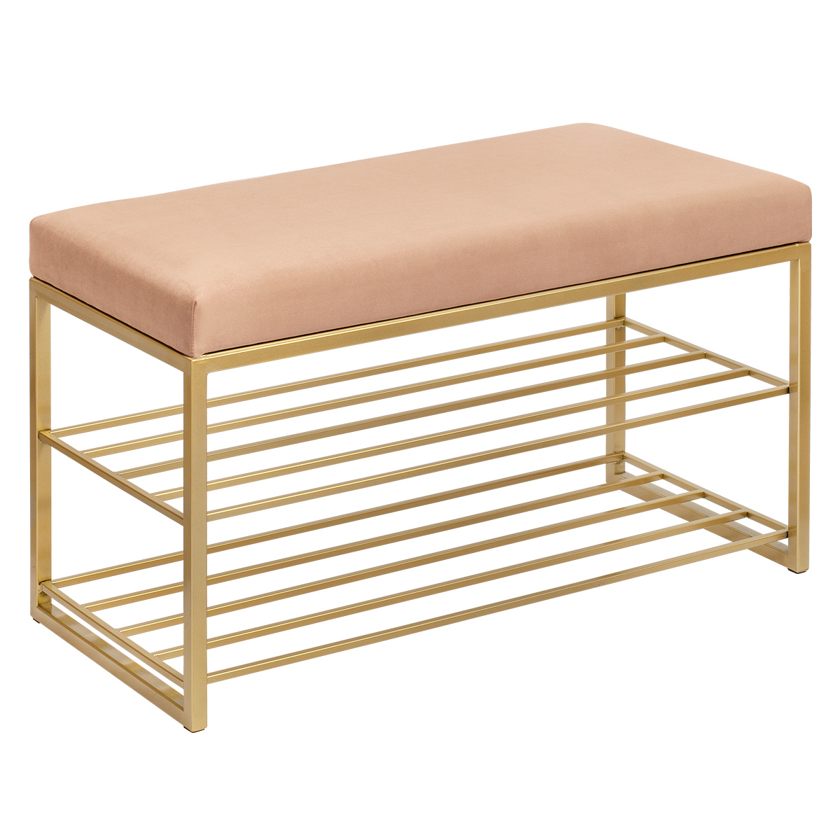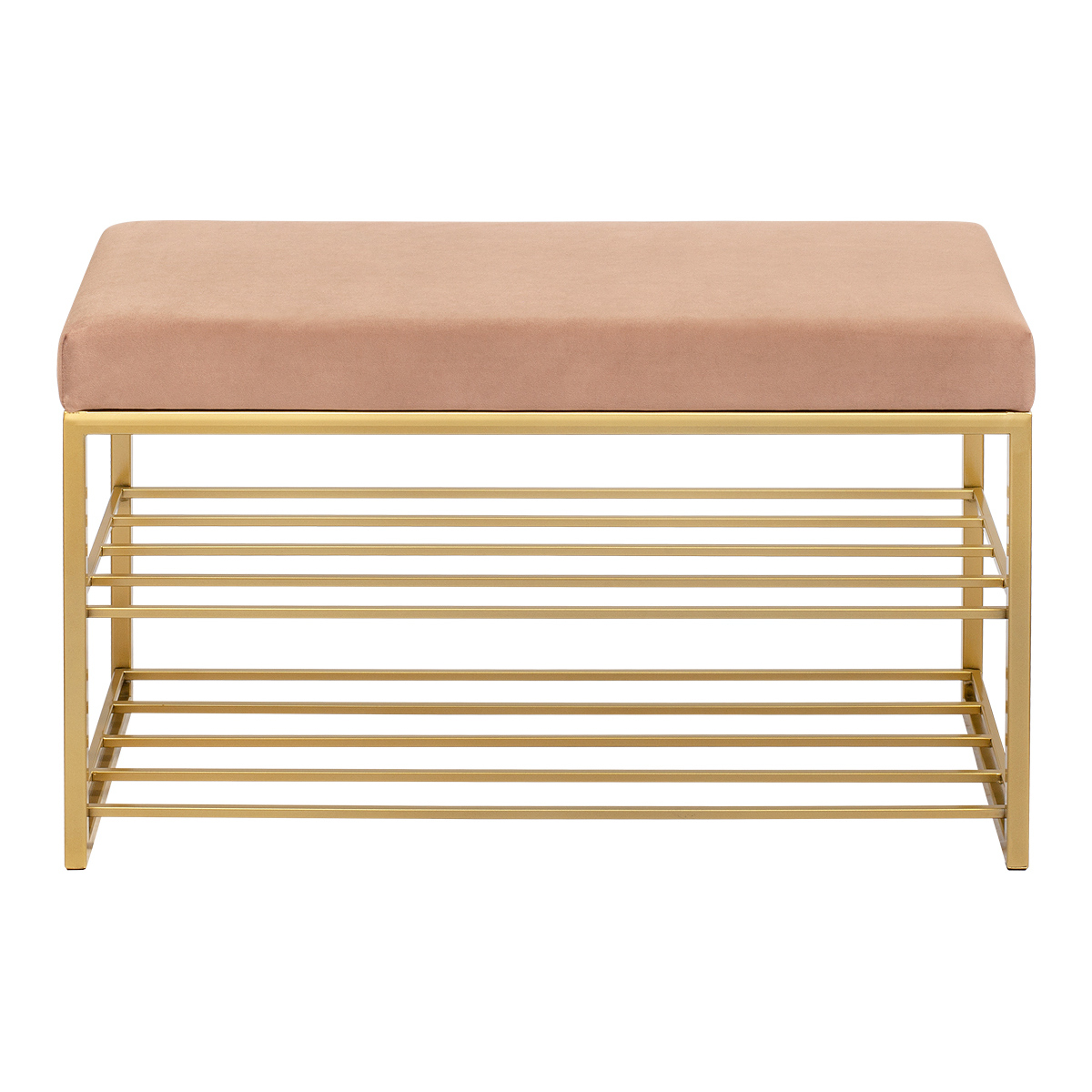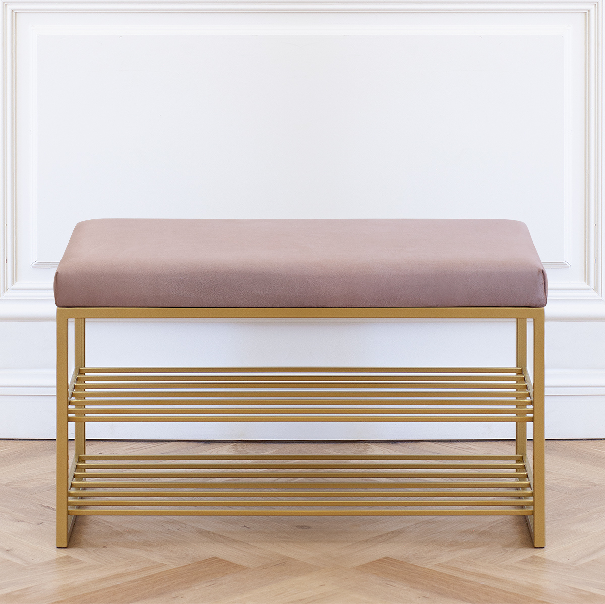Обувница GARDA с золотистым основанием и велюровой подушкой — стильная и функциональная мебель для прихожей, гостиной или кабинета. Компактная банкетка не займет много места, но обеспечит удобство благодаря двум полкам и мягкой скамье.