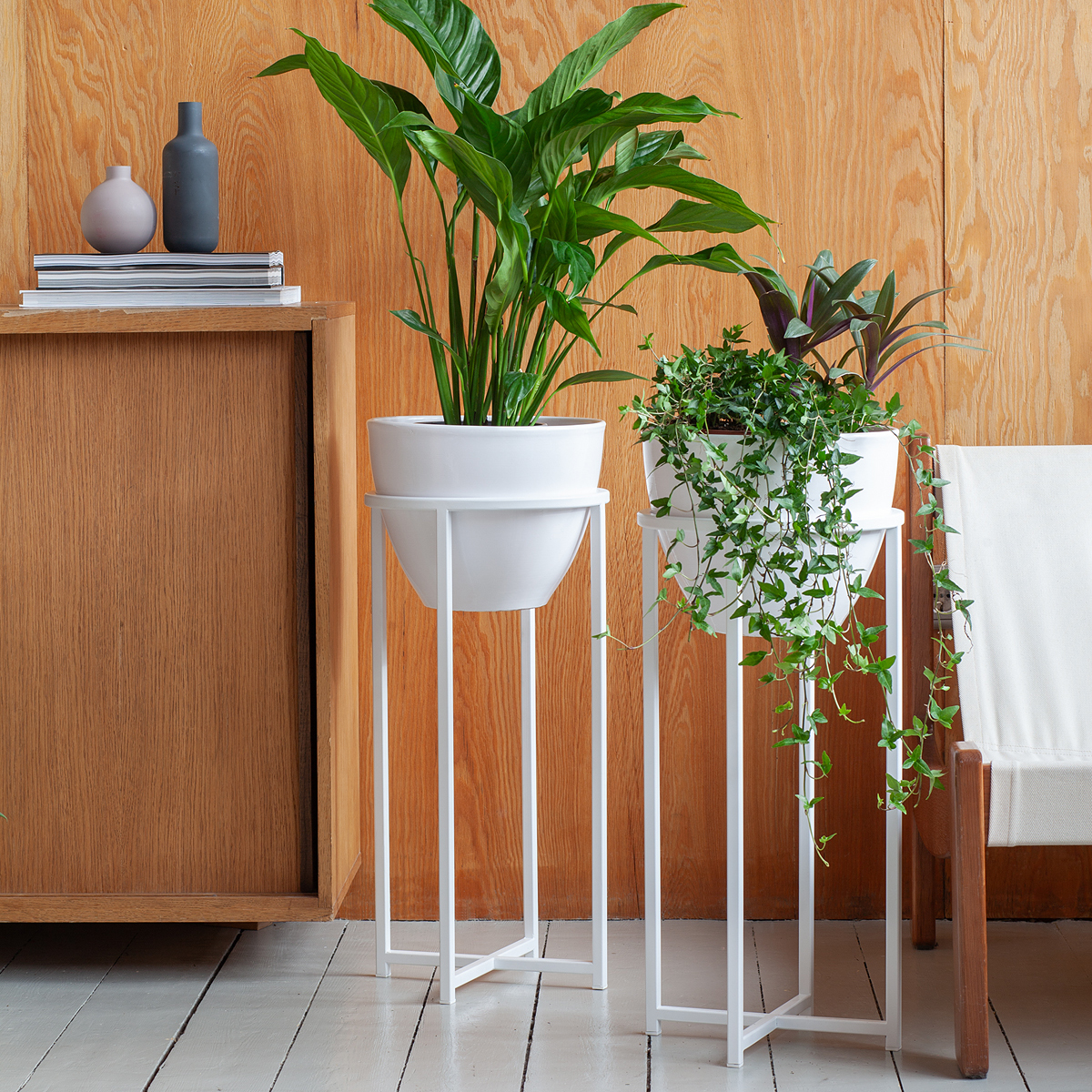 Металлическая подставка под кашпо GRACE с белым основанием из стали.
