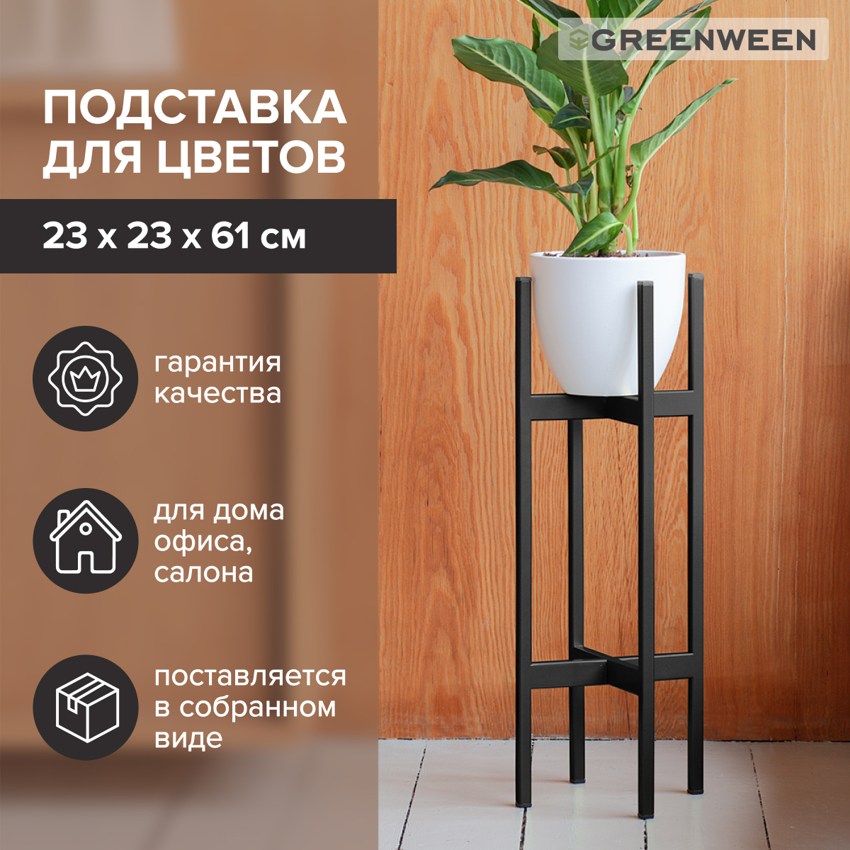 Размеры подставки (ш х г х в): 230x230х610 мм, вес - 2 кг. Держатель для клмнатных растений подходит для кашпо до 20 см в диаметре. глубина под кашпо - 13 см. Подставка выдерживает вес до 20 кг. Подставка не требует сборки, доставляем в собранном виде.