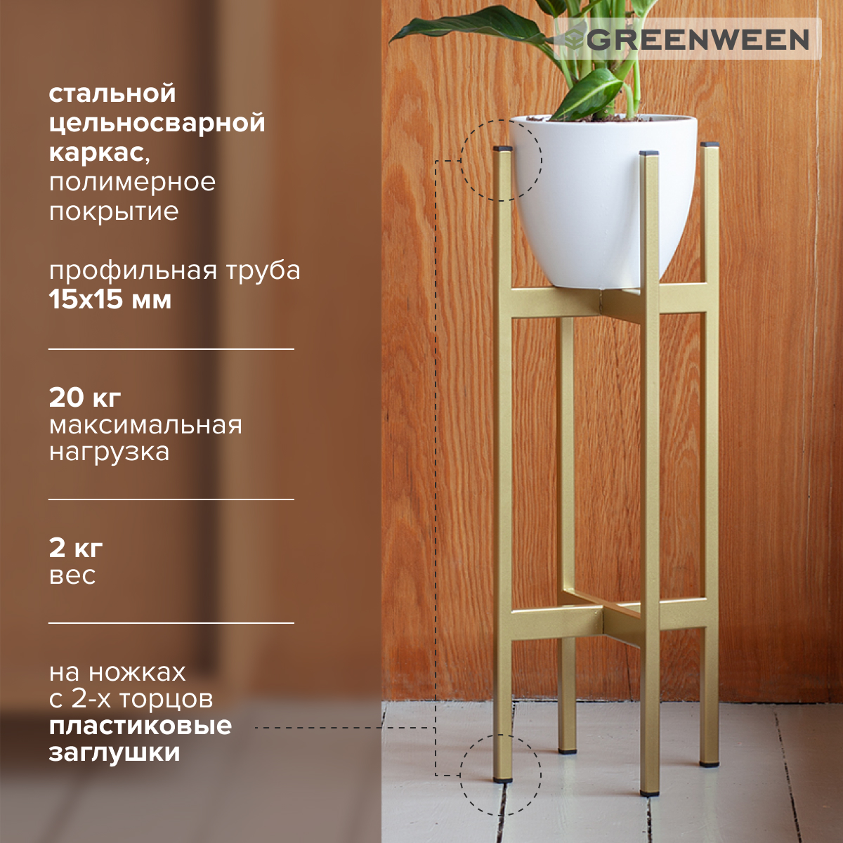 Держатель для кашпо на 4-х ножках изготовлен из профильной трубы 15х15 мм, покрытой порошковой краской. Прочная цельносварная конструкция из стали с полимерным покрытием обеспечивает безопасность и устойчивость к механическим повреждениям. Собственное производство гарантирует надежность и эстетику сварных швов.