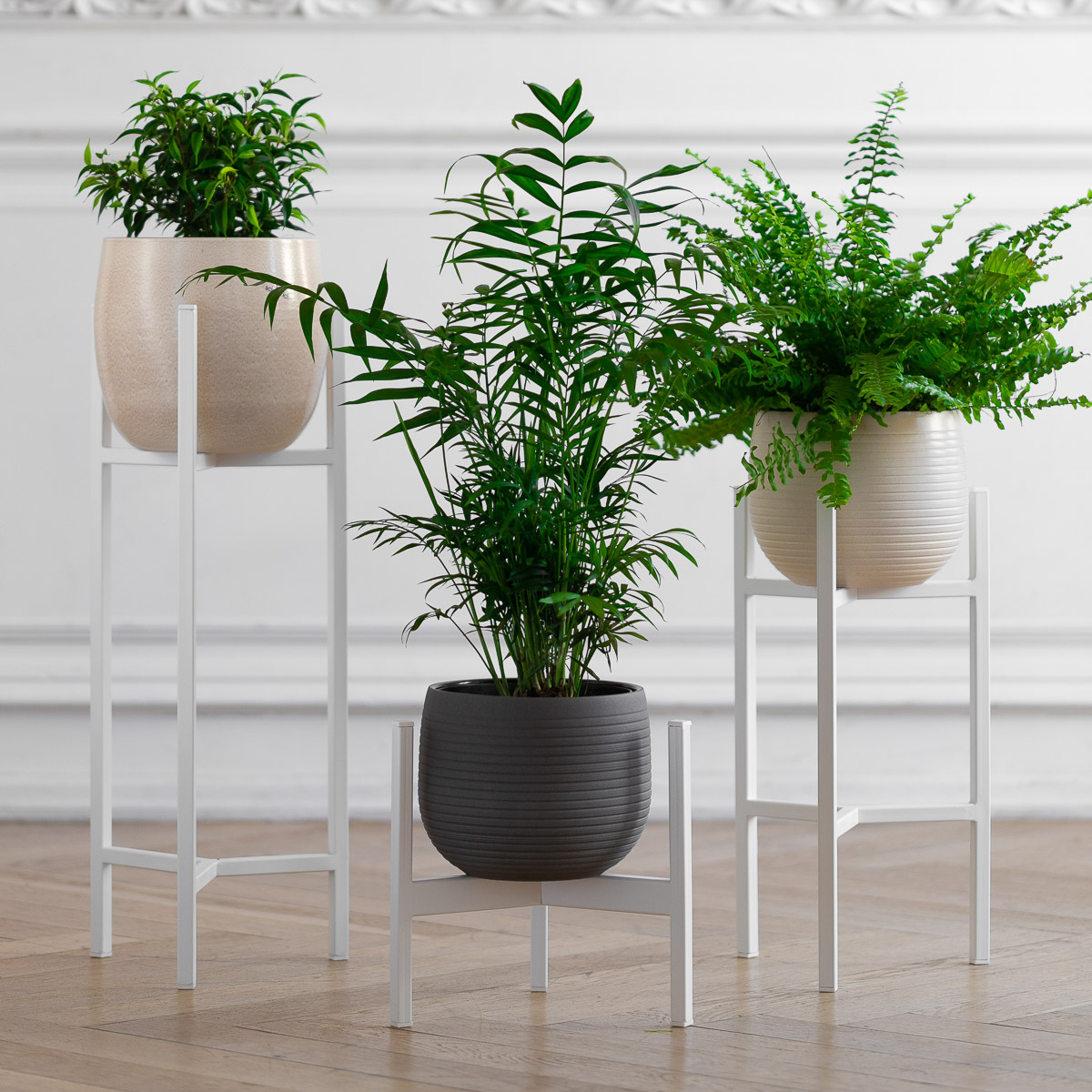 Металлическая подставка под кашпо TRINITY с белым основанием из стали.