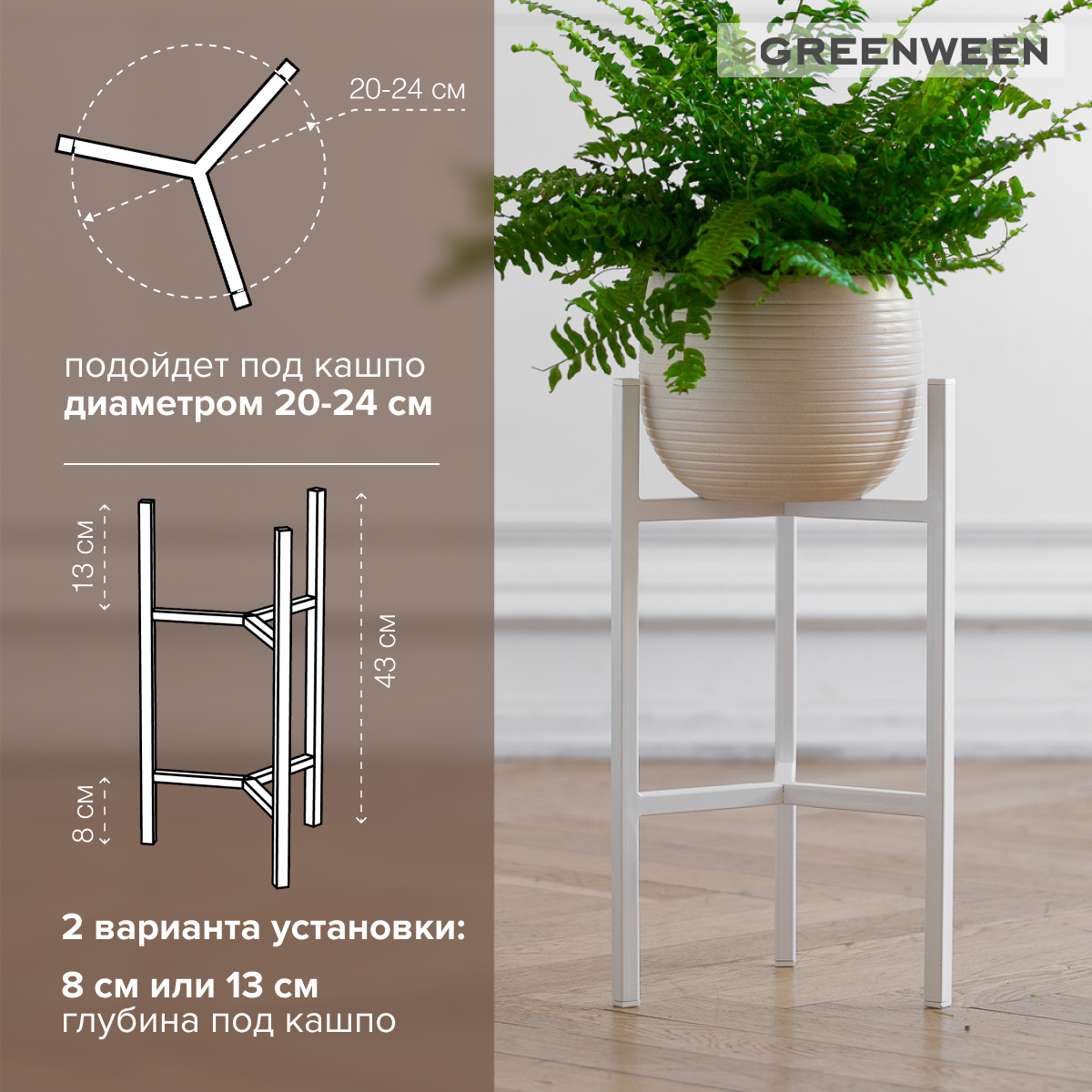Вы можете разместить кашпо от 20 см до 24 см в диаметре. Возможность двустороннего использования (глубина места для размещения цветочного горшка 8 и 13 см). Высота подставки 43 см