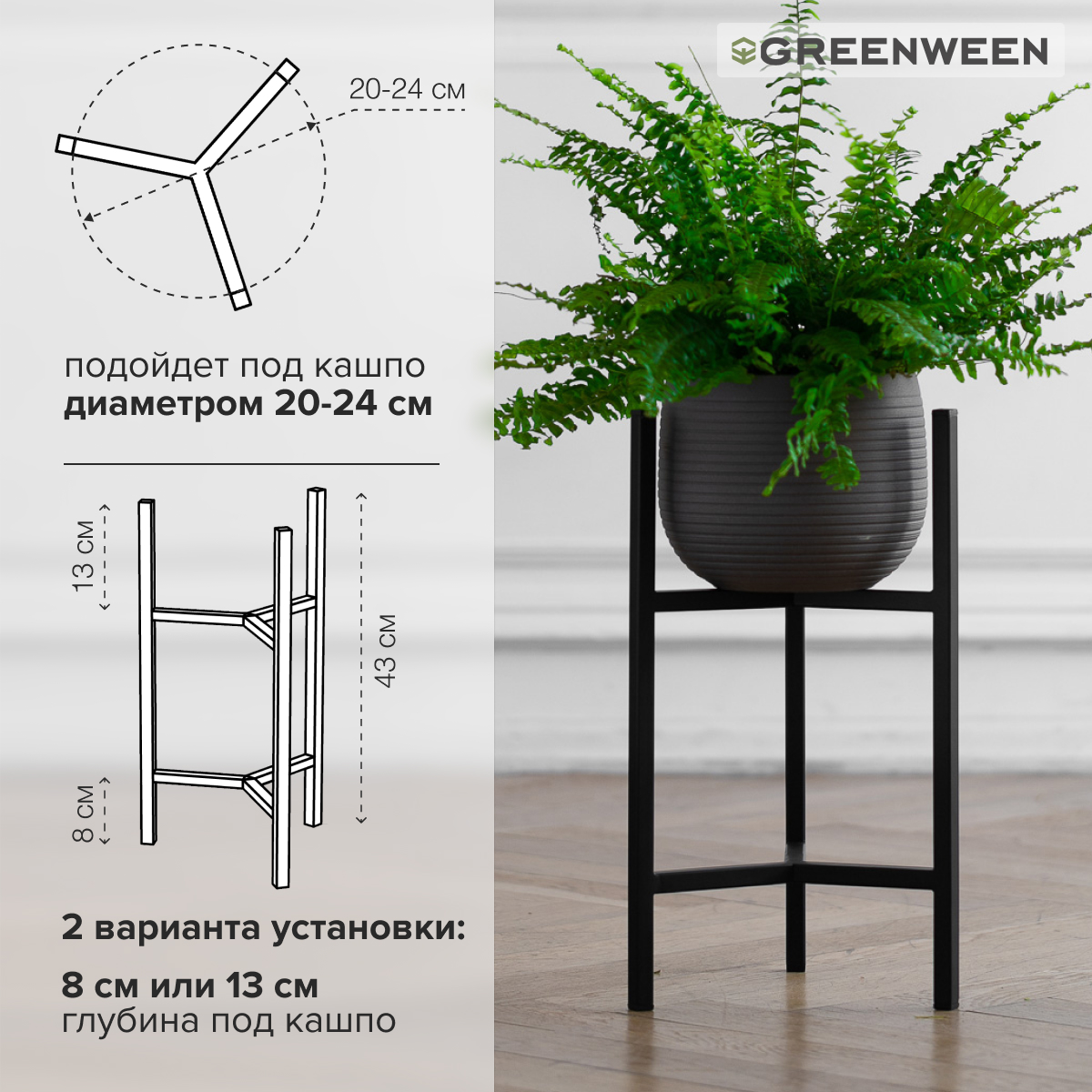 Вы можете разместить кашпо от 20 см до 24 см в диаметре. Возможность двустороннего использования (глубина места для размещения цветочного горшка 8 и 13 см).