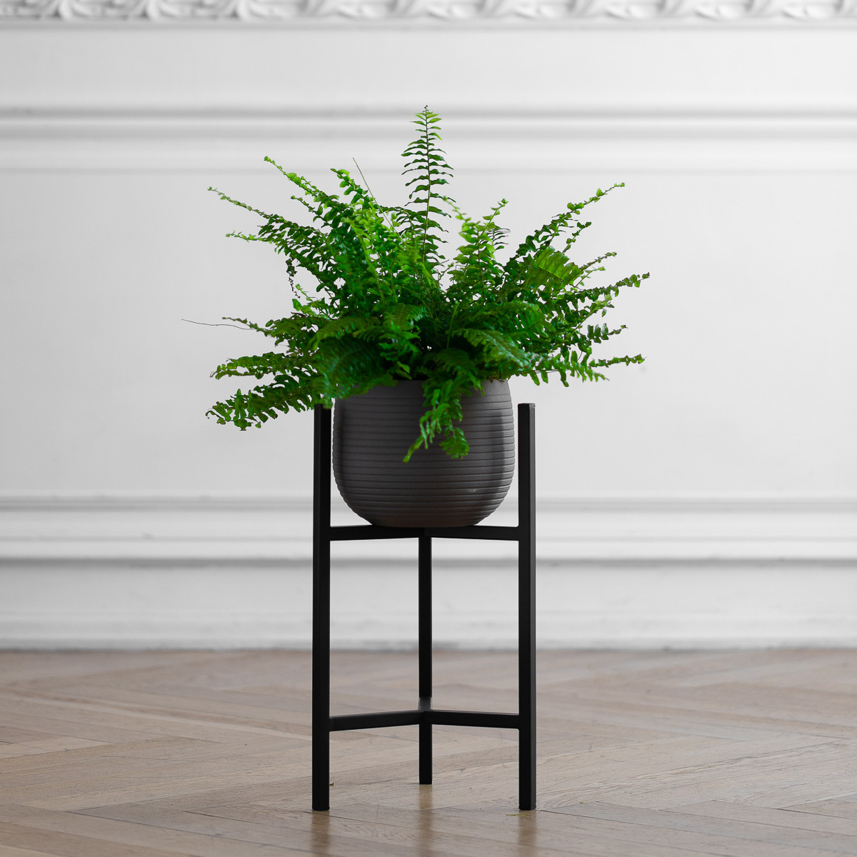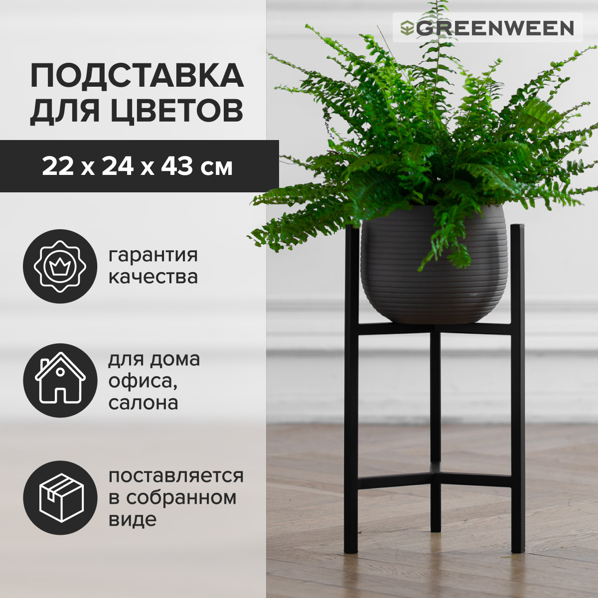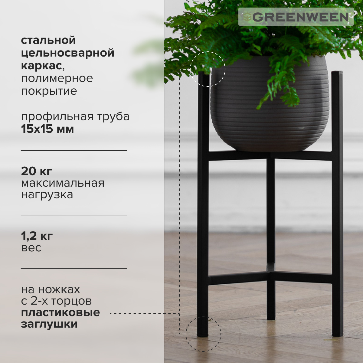 Подставка под комнатные растения в черном цвете для любителей интерьера в стиле лофт, сканди и минимализм! Подойдёт для размещения кашпо с крупным растением на полу. Черный цвет подставки выгодно подчеркивает красоту кашпо и комнатного растения, делая обстановку помещения более стильной. Пластиковые заглушки в цвете подставки на ножках защитят пол от царапин.