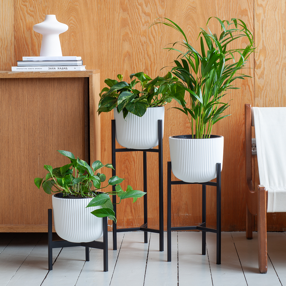Металлическая подставка под кашпо TRINITY с черным основанием из стали.