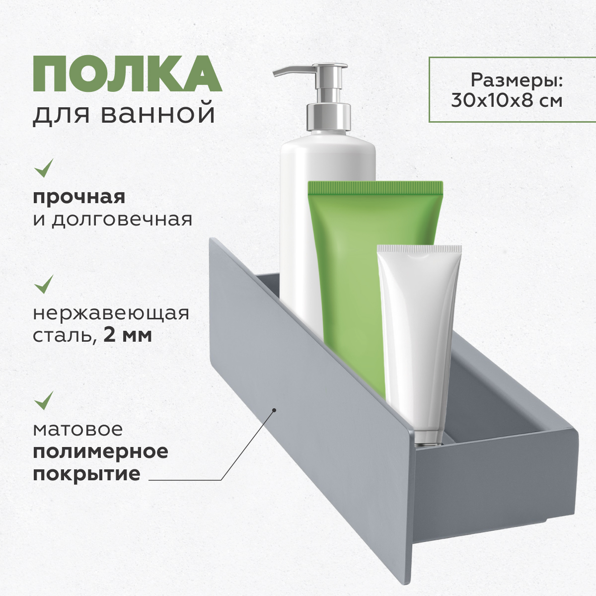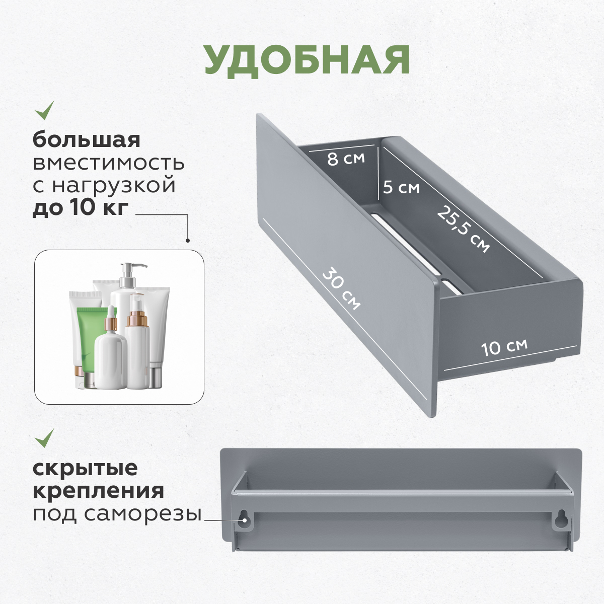 Эргономичная конструкция. Компактные размеры и продуманная форма позволяют удобно размещать гигиенические принадлежности и аксессуары.