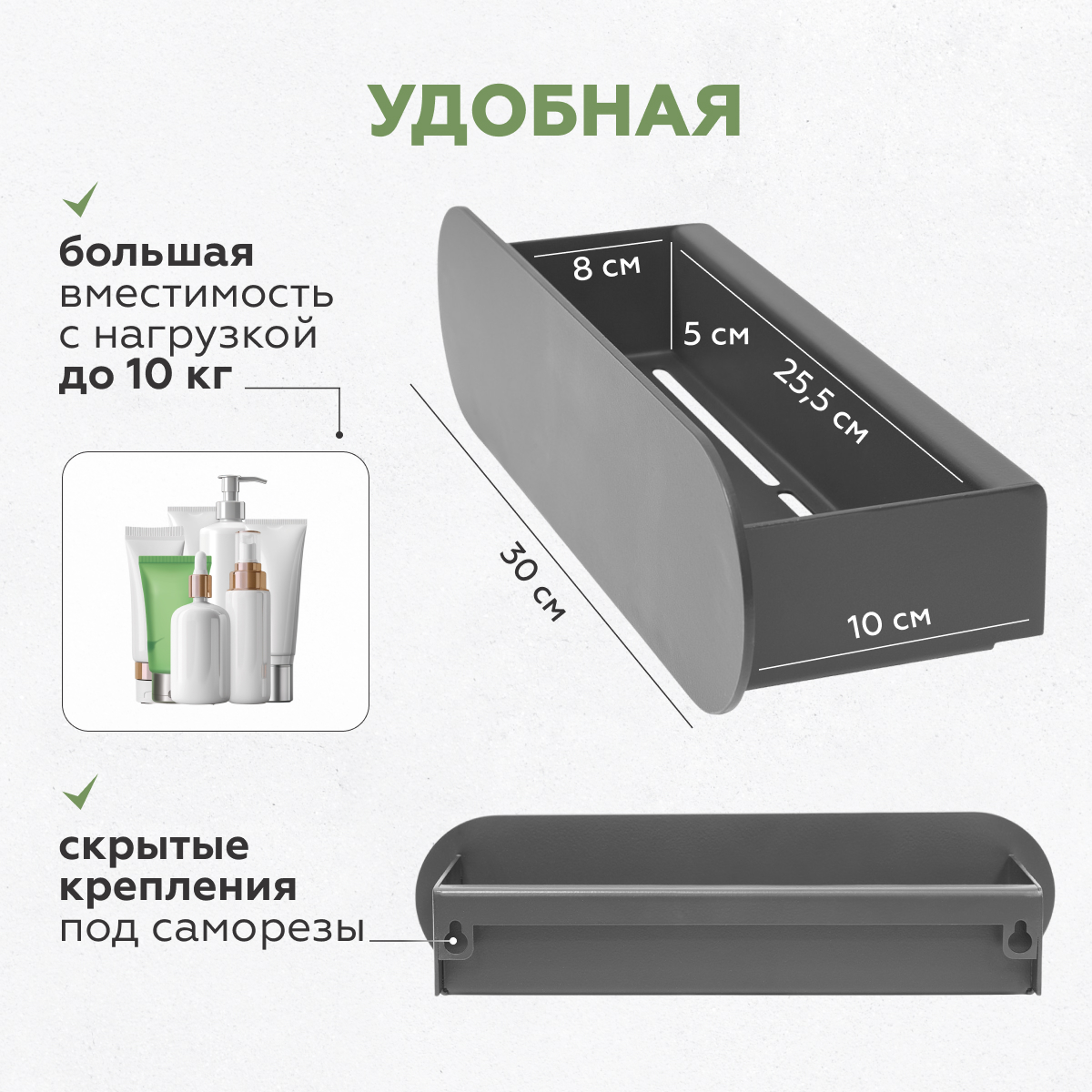Эргономичная конструкция. Компактные размеры и продуманная форма позволяют удобно размещать гигиенические принадлежности и аксессуары.