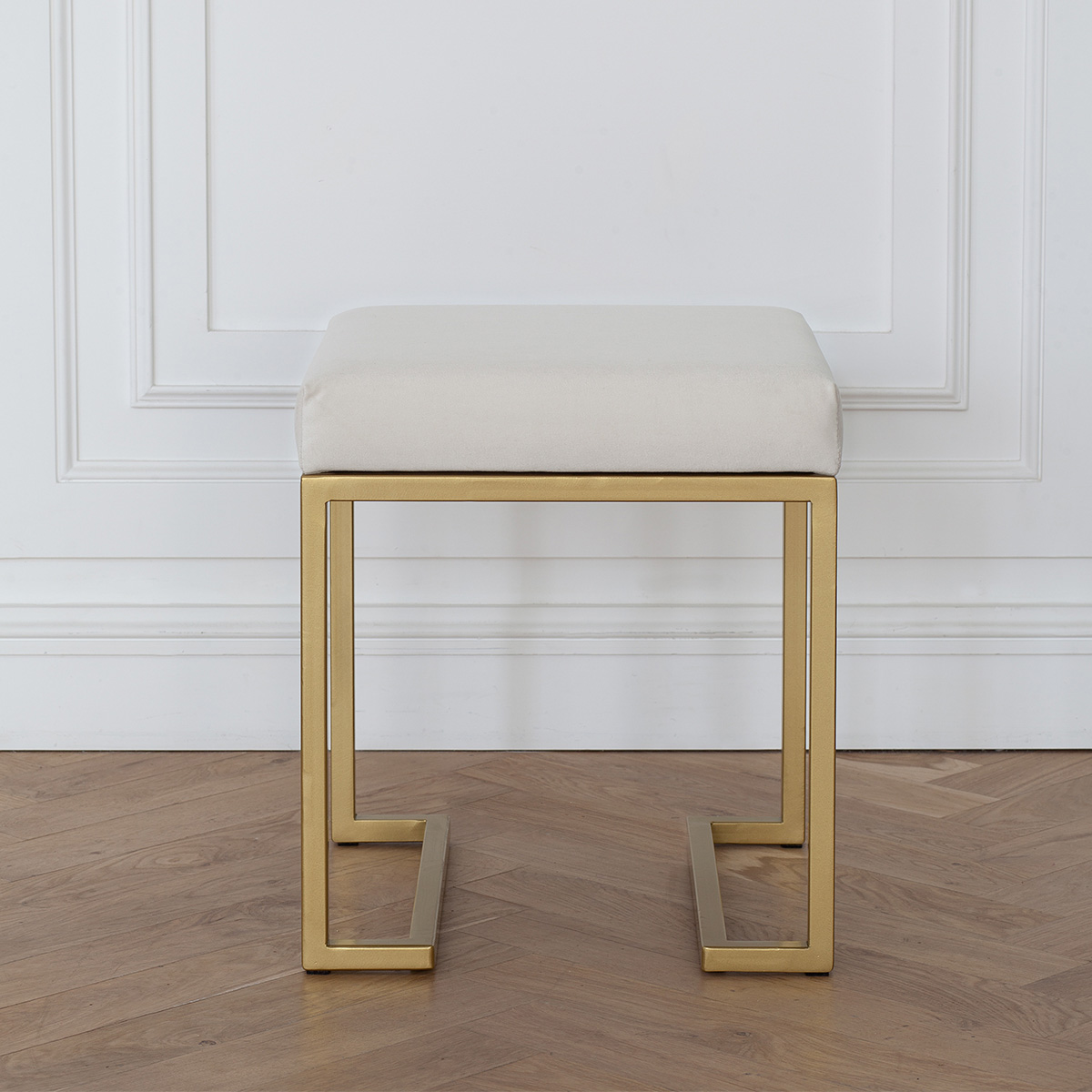 Пуф OMEGA с золотым основанием и велюровой подушкой.