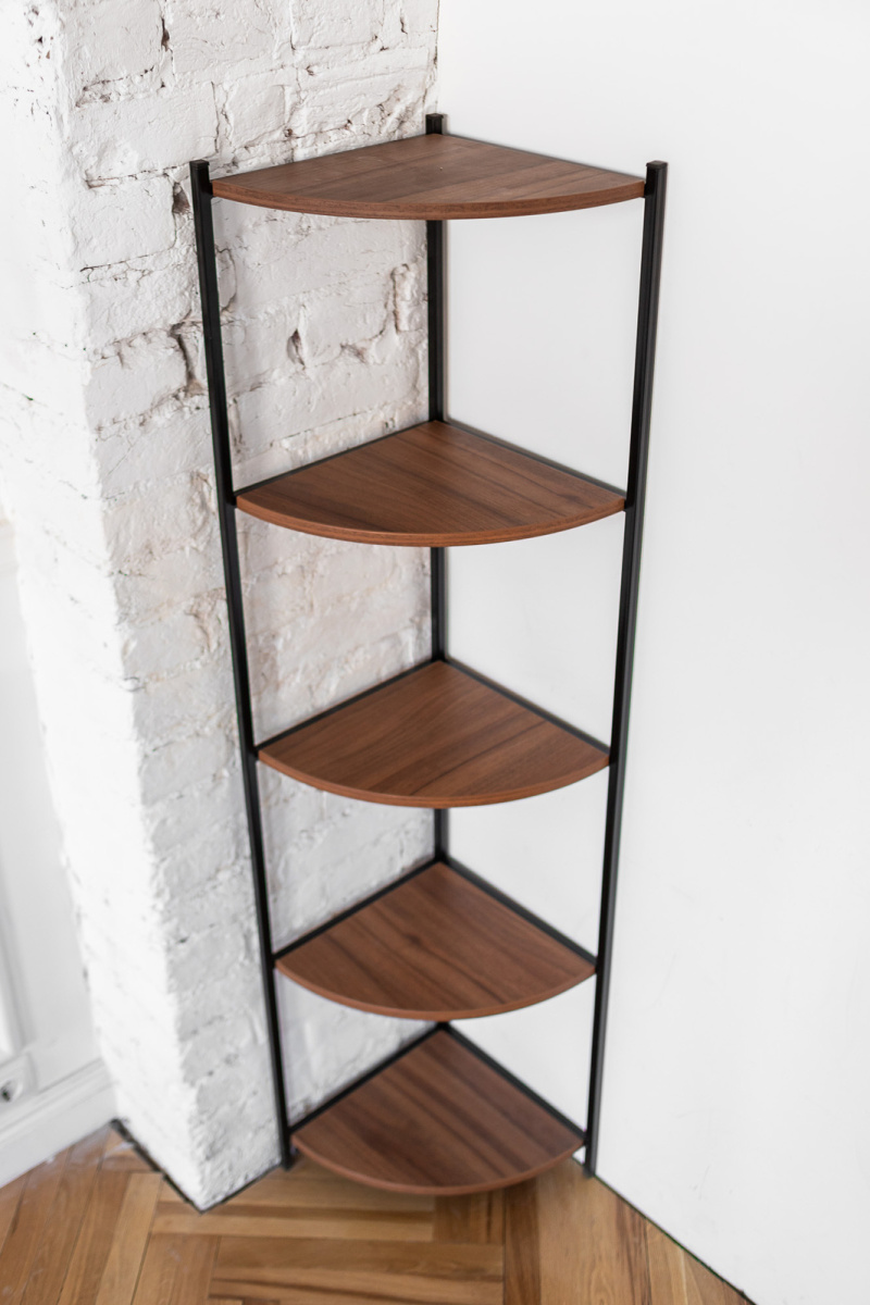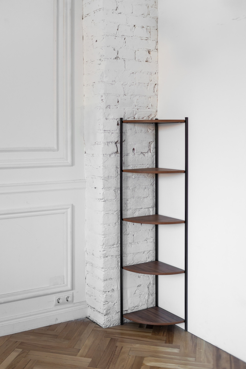 Каркас стеллажа изготовлен из стали, окрашенной порошковой краской. Полки стеллажа выполнены из ЛДСП толщиной 16 мм, выдерживают нагрузку до 10 кг. Напольный стеллаж не требует дополнительного крепления к стене, устойчив за счет собственного веса.