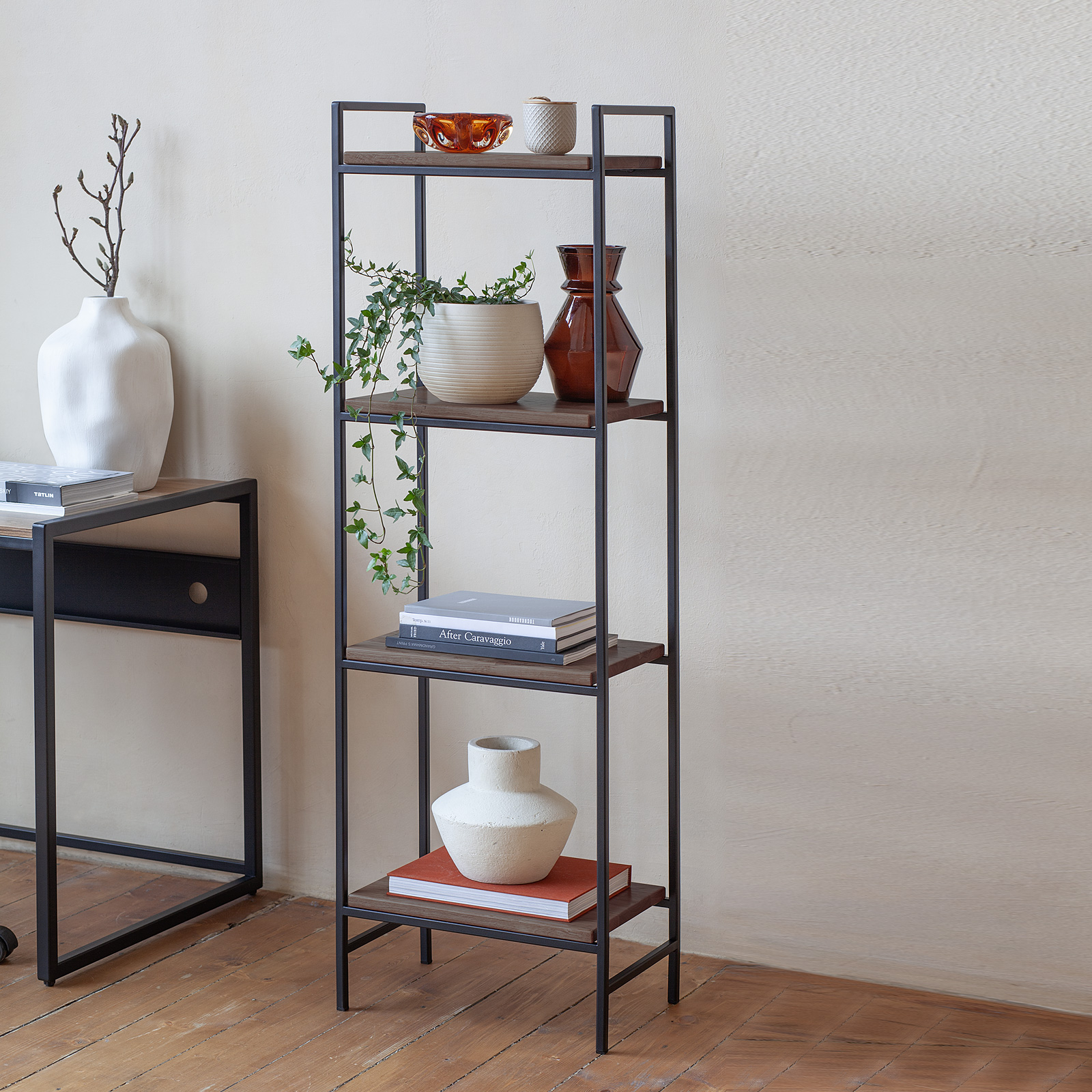 Черный металлический стеллаж ALTO с полками из ЛДСП в цвете Орех привлекает внимание элегантным дизайном и функциональностью. Стильный вместительный стеллаж поможет организовать пространство в гостиной, спальне, кабинете и ванной комнате.