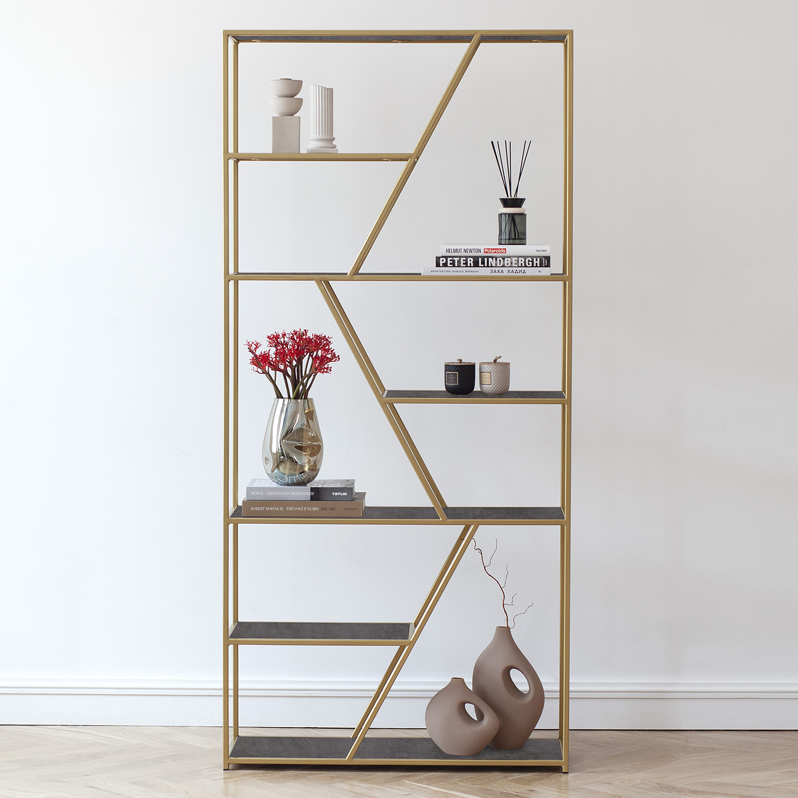 Золотой стеллаж ARNETTA с полками из натурального камня привлекает внимание своим элегантным дизайном и функциональностью. Он идеально впишется в любой интерьер, будь то гостиная, спальня или кабинет.