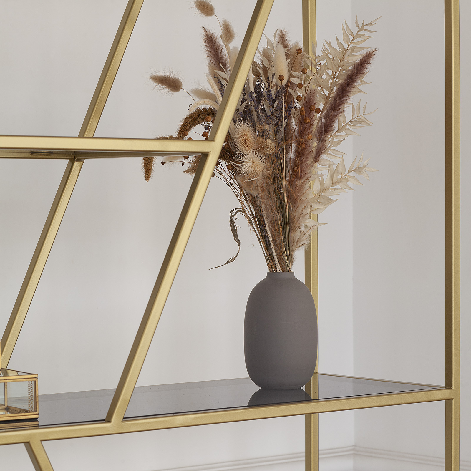 Сочетание золотого каркаса и полок из закаленного тонированного стекла придает стеллажу утонченность и позволяет использовать его в современном интерьере. Стеллаж ARNETTA станет отличным дополнением в квартире, загородном доме, офисе, студии или салоне.