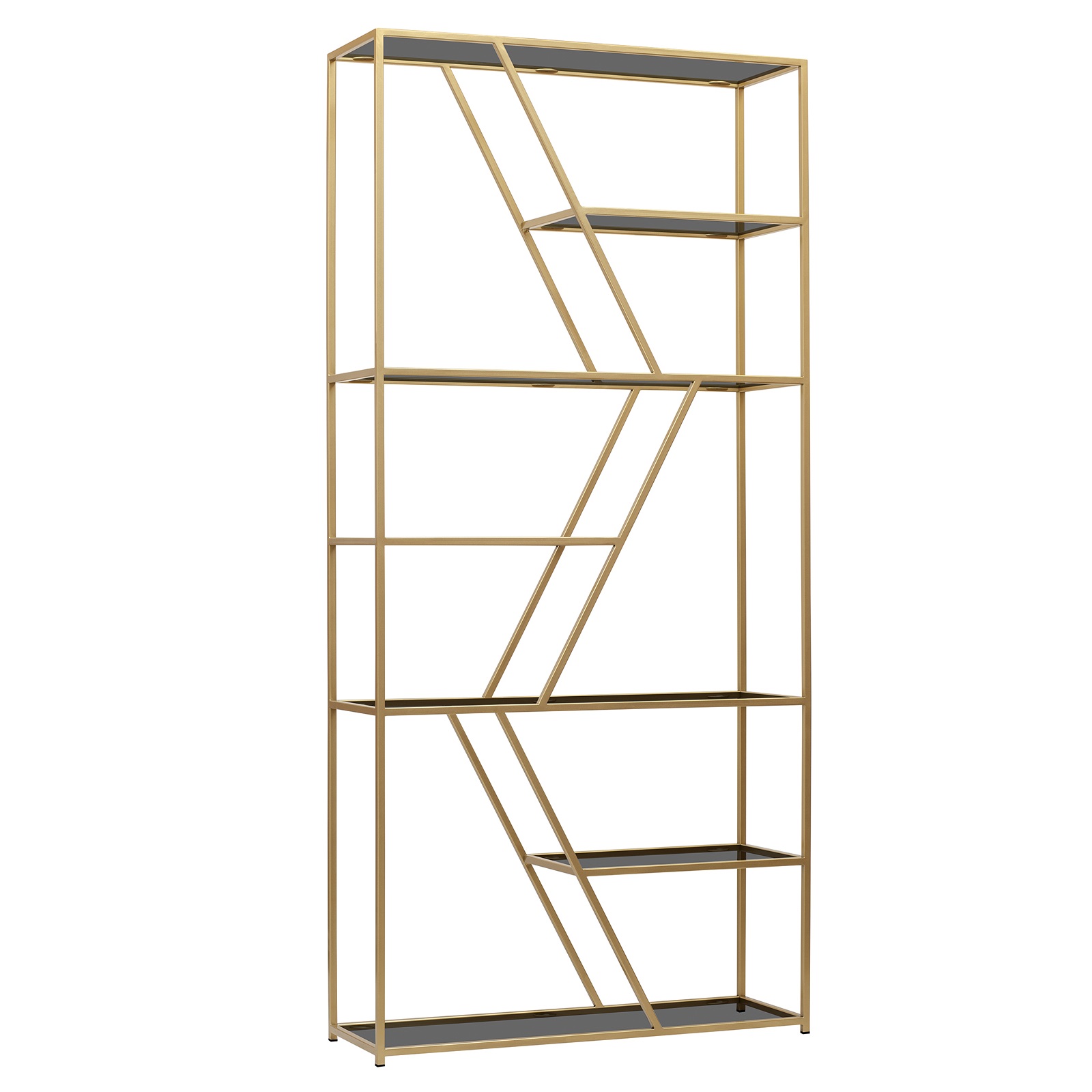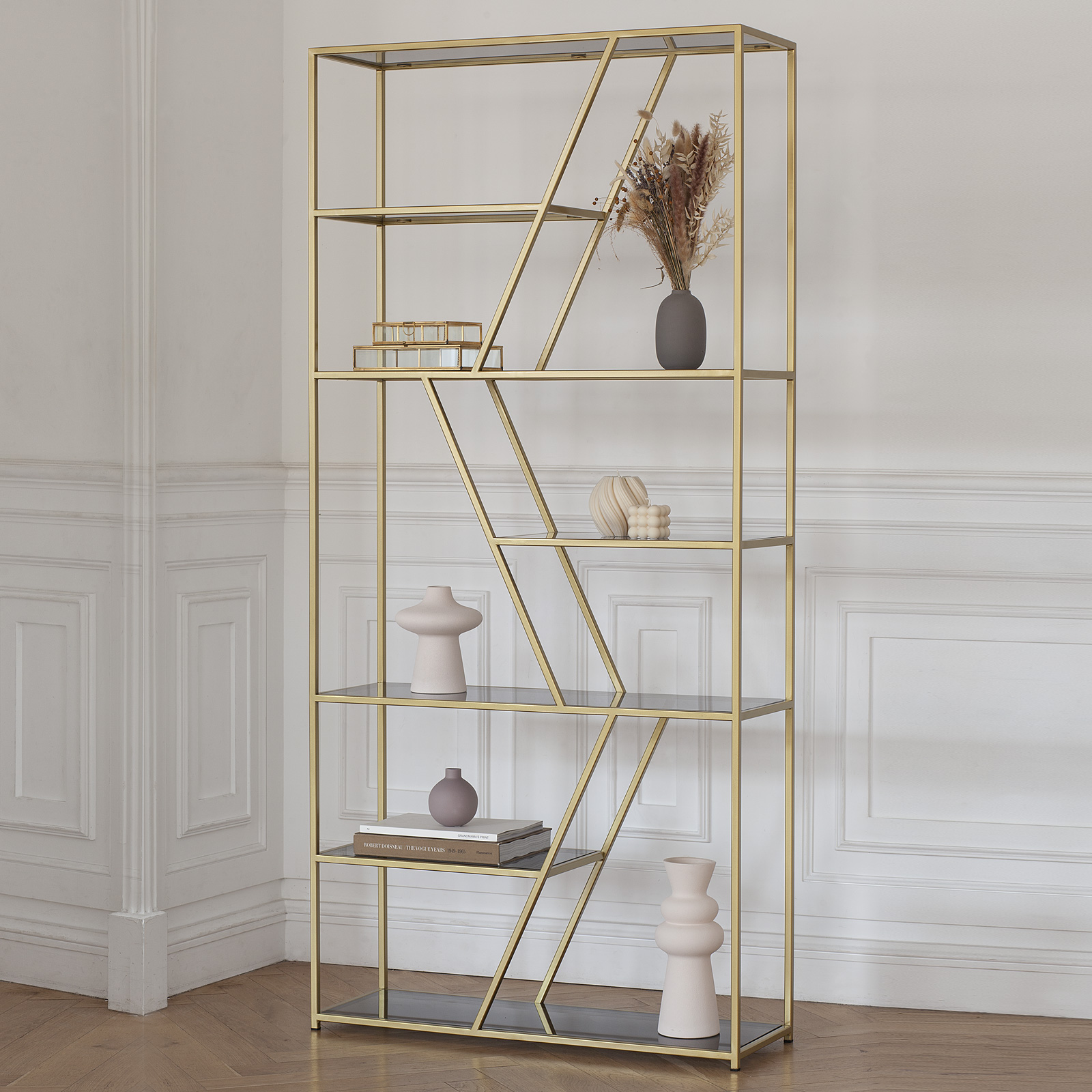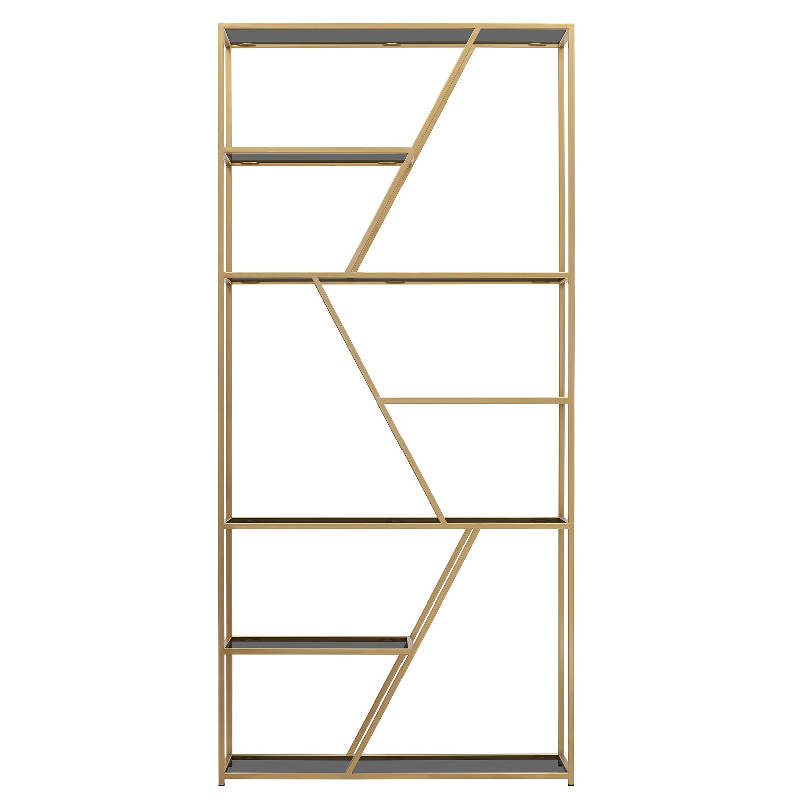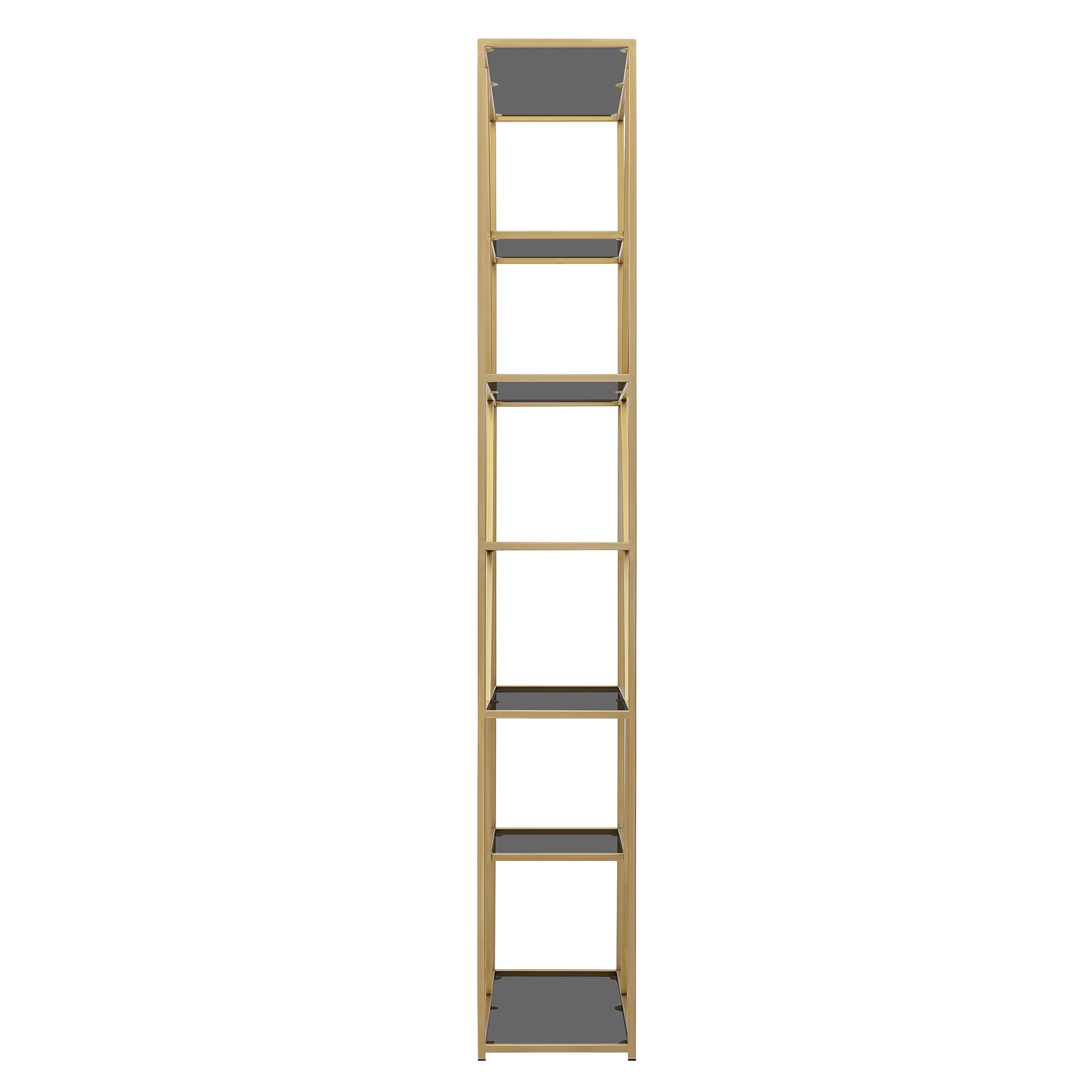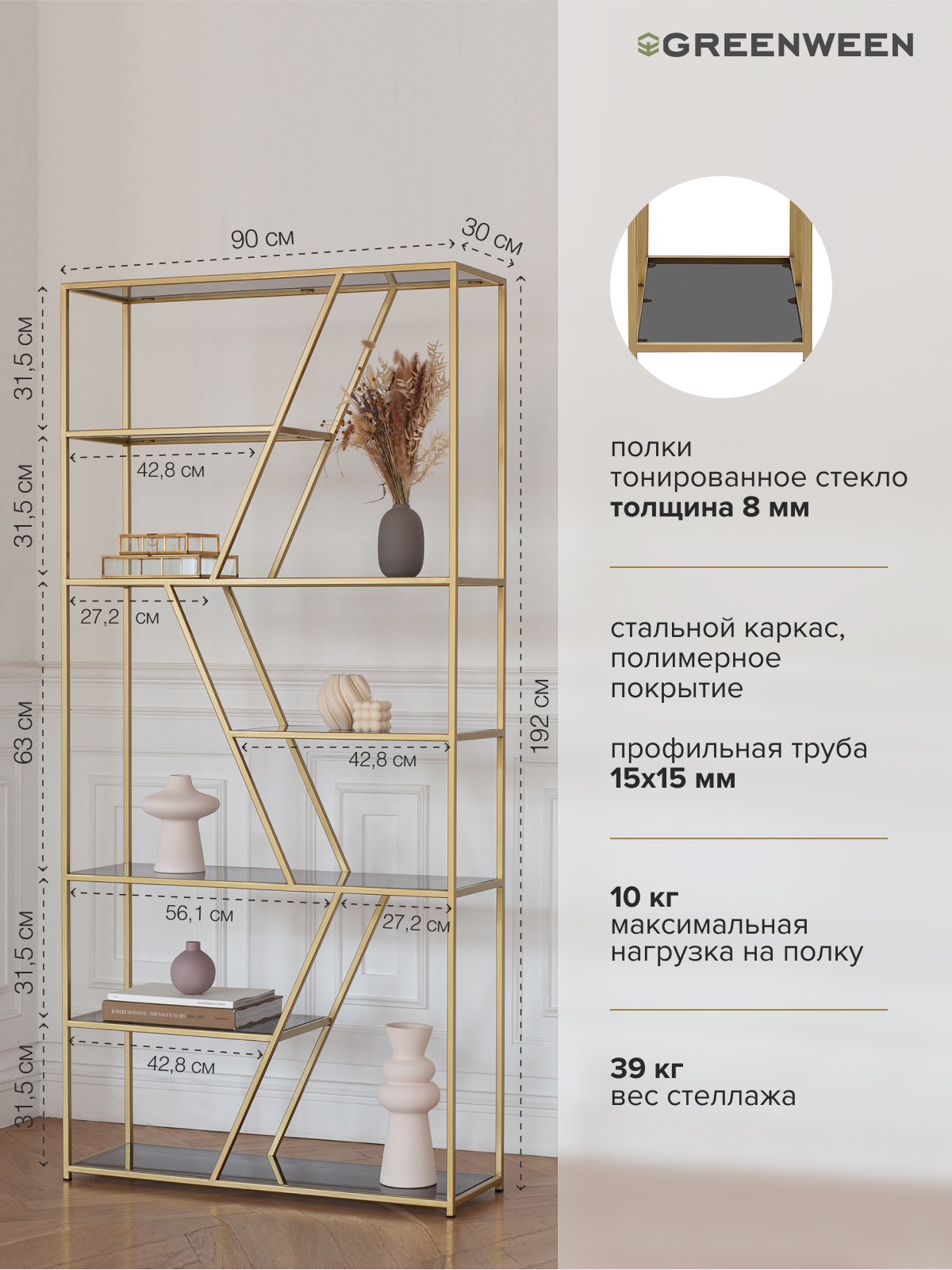 Золотой стеллаж ARNETTA с полками из закаленного тонированного стекла привлекает внимание своим элегантным дизайном и функциональностью. Он идеально впишется в любой интерьер, будь то гостиная, спальня или кабинет.