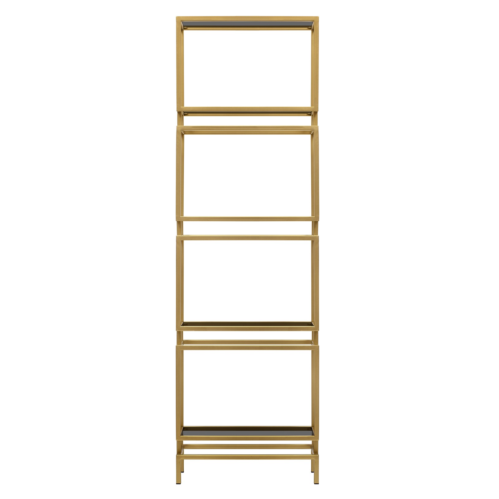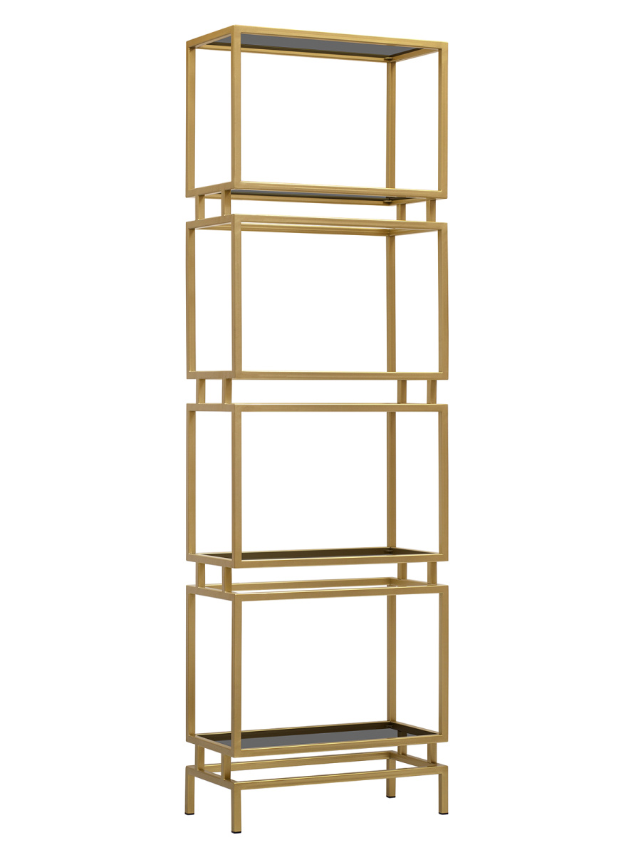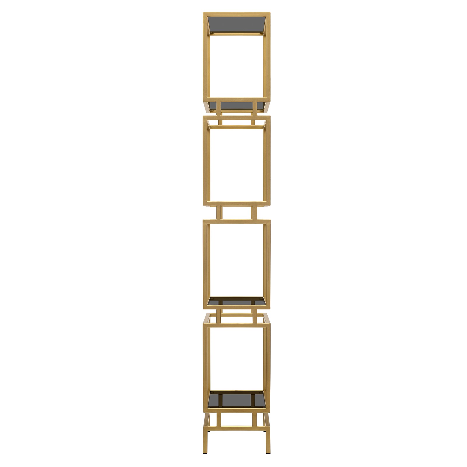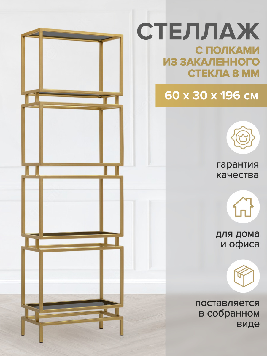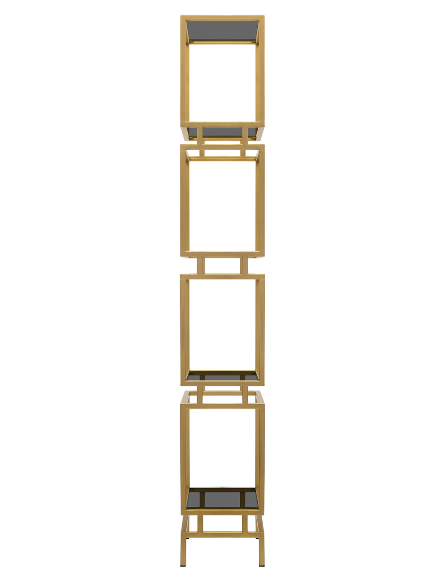 Золотой металлический стеллаж BRICK с полками из закаленного тонированного стекла привлекает внимание элегантным дизайном и функциональностью.