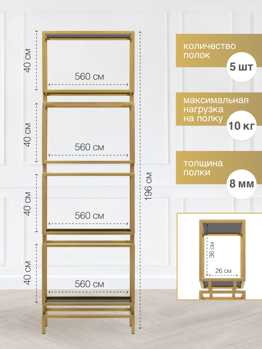Золотой стеллаж BRICK с прямоугольными нишами — стильное решение для современного интерьера. Его компактный размер позволяет разместить стеллаж в любой комнате: гостиной, столовой, спальне или детской. Сочетание золотого каркаса и полок из закаленного тонированного стекла придает мебели элегантность и утонченность. Открытые полки идеально подходят для хранения декора, бытовой техники, игрушек и цветов.