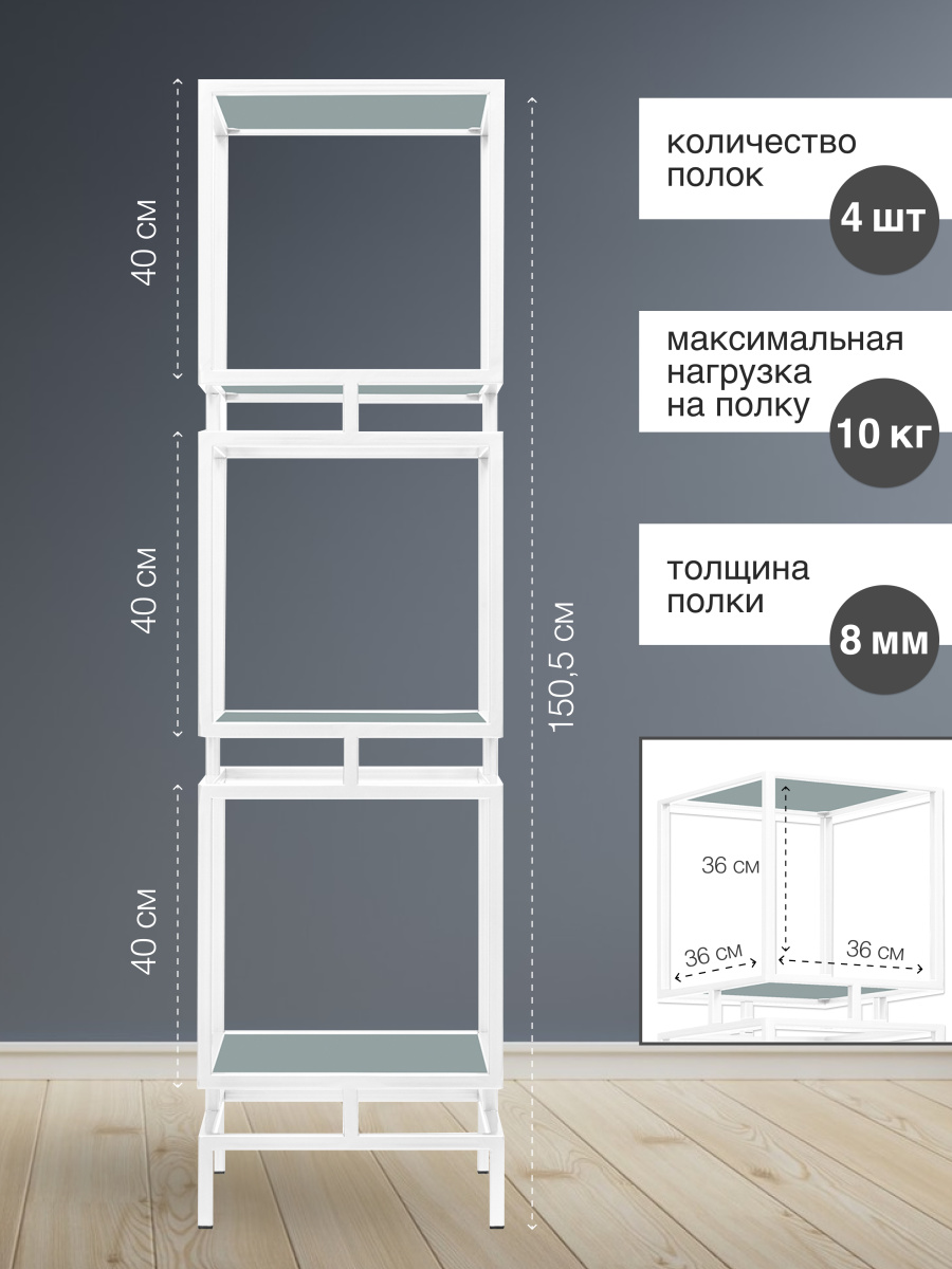 Каркас изготовлен из стали с полимерным покрытием, а полки из ЛДСП толщиной 8 мм выдерживают до 10 кг. Напольную конструкцию не нужно крепить к стене, она устойчива благодаря собственному весу.