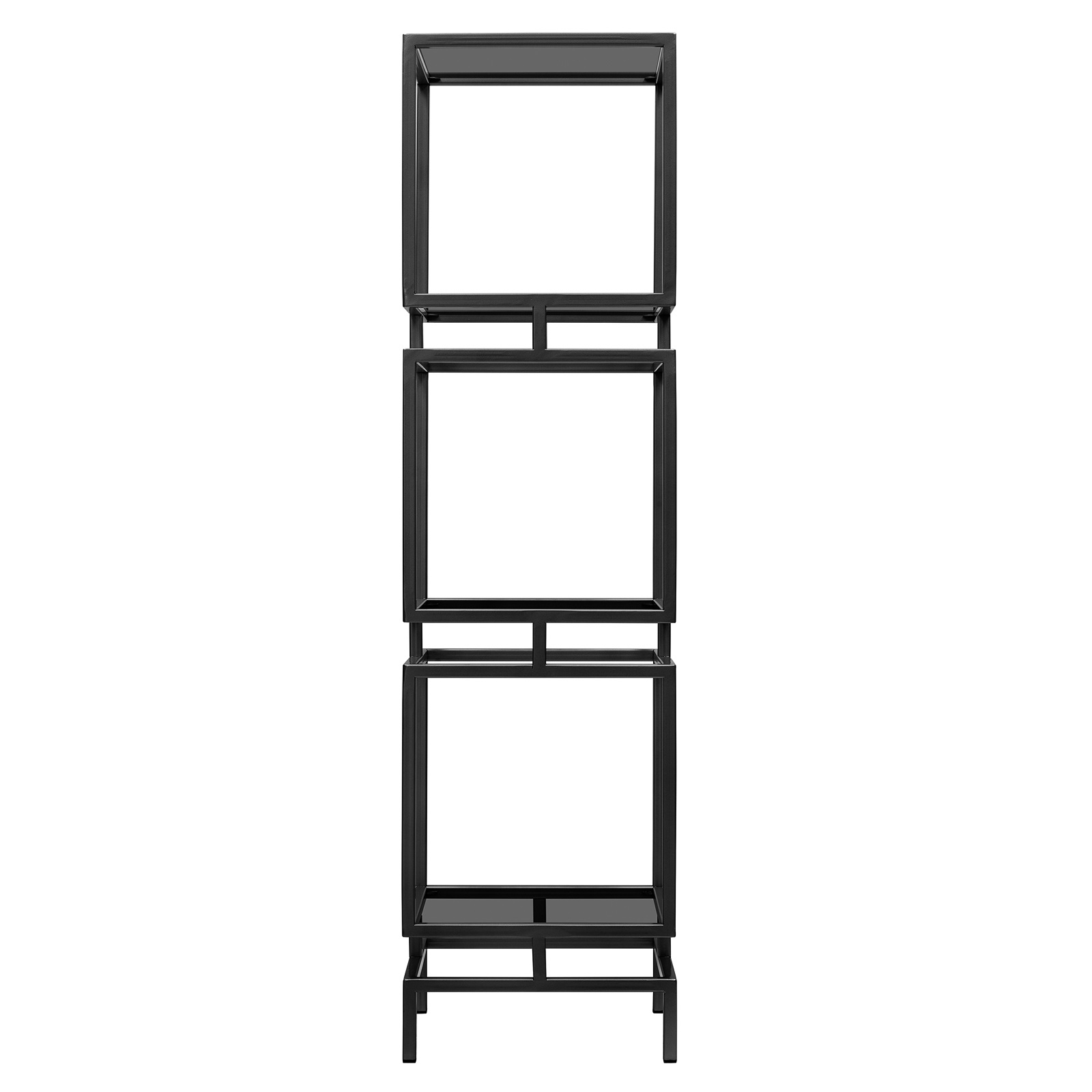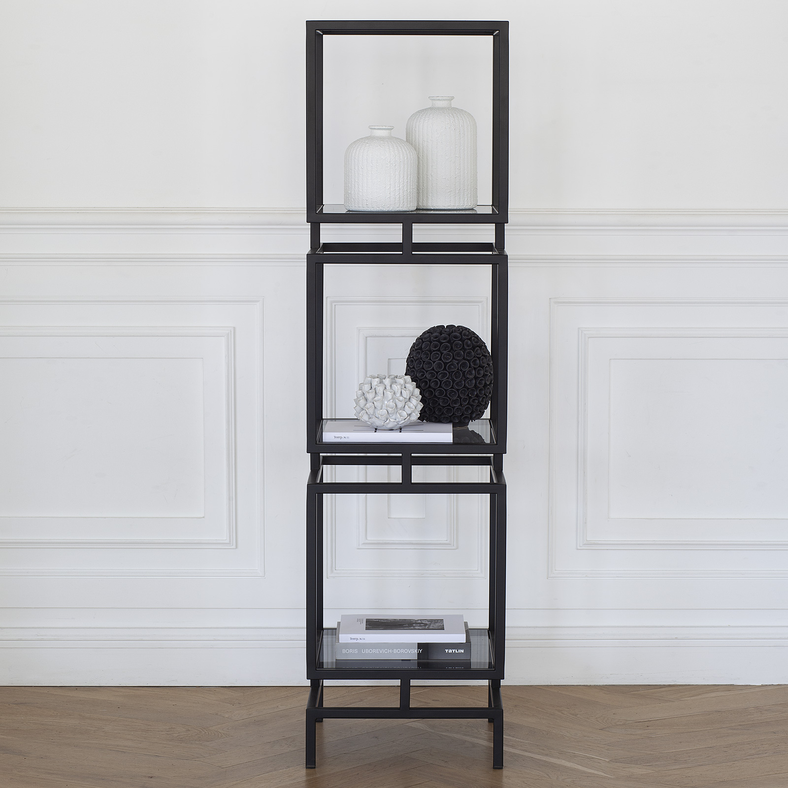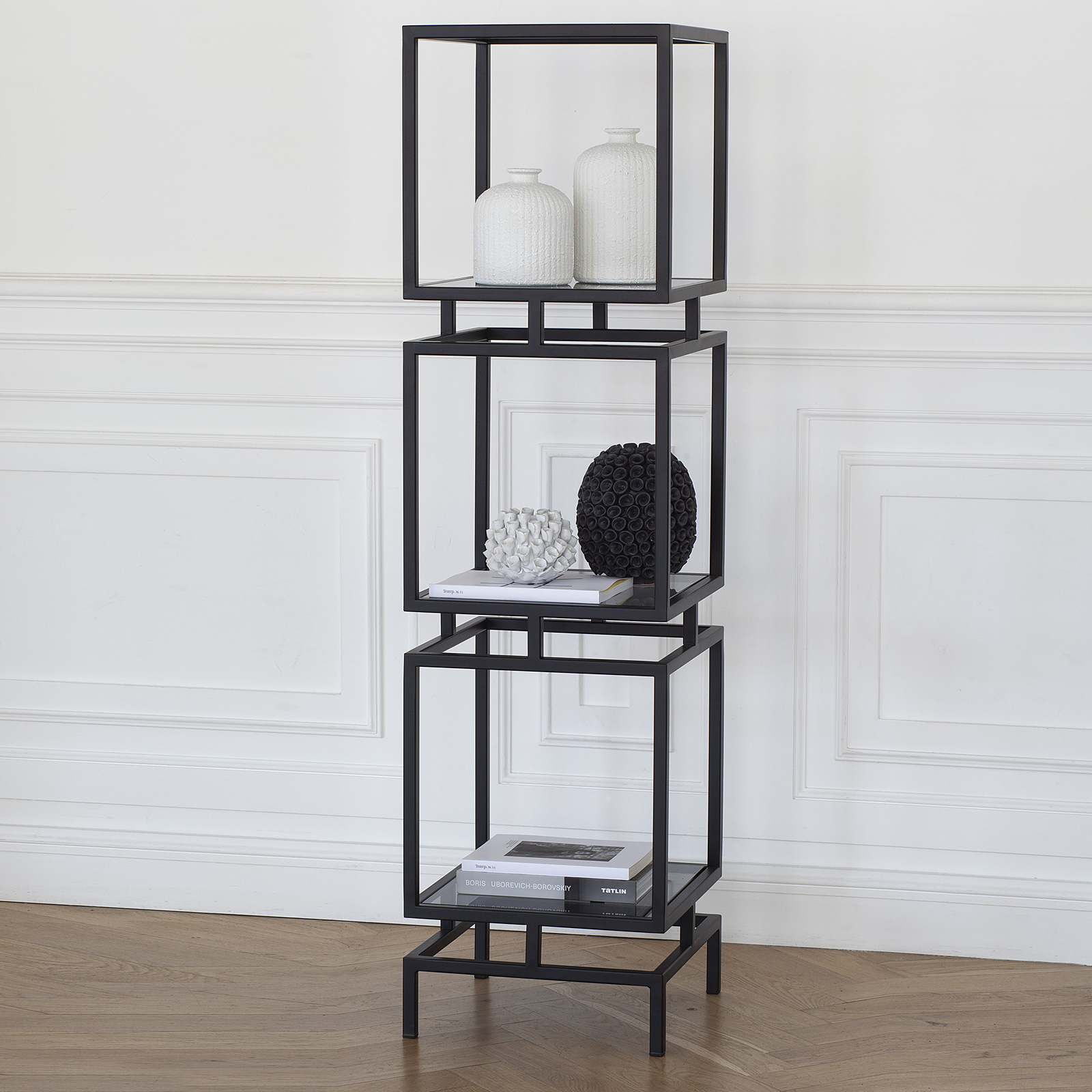 Черный металлический стеллаж CUBIC-3 с полками из закаленного тонированного стекла привлекает внимание элегантным дизайном и функциональностью.